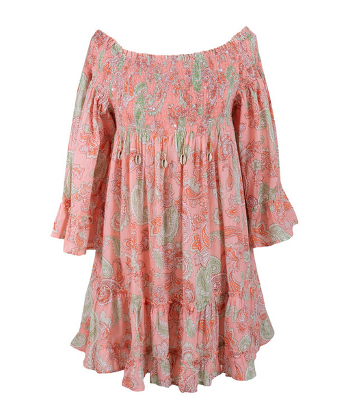 Puuvillainen persikan ja vihreän sävyinen kuviollinen mekko jossa smokkirypytetty yläosa ja leveät hihat. Yläosassa koristestrassit sekä helminauhoista roikkuvat simpukat. Koko L/XL. 100% puuvilla.