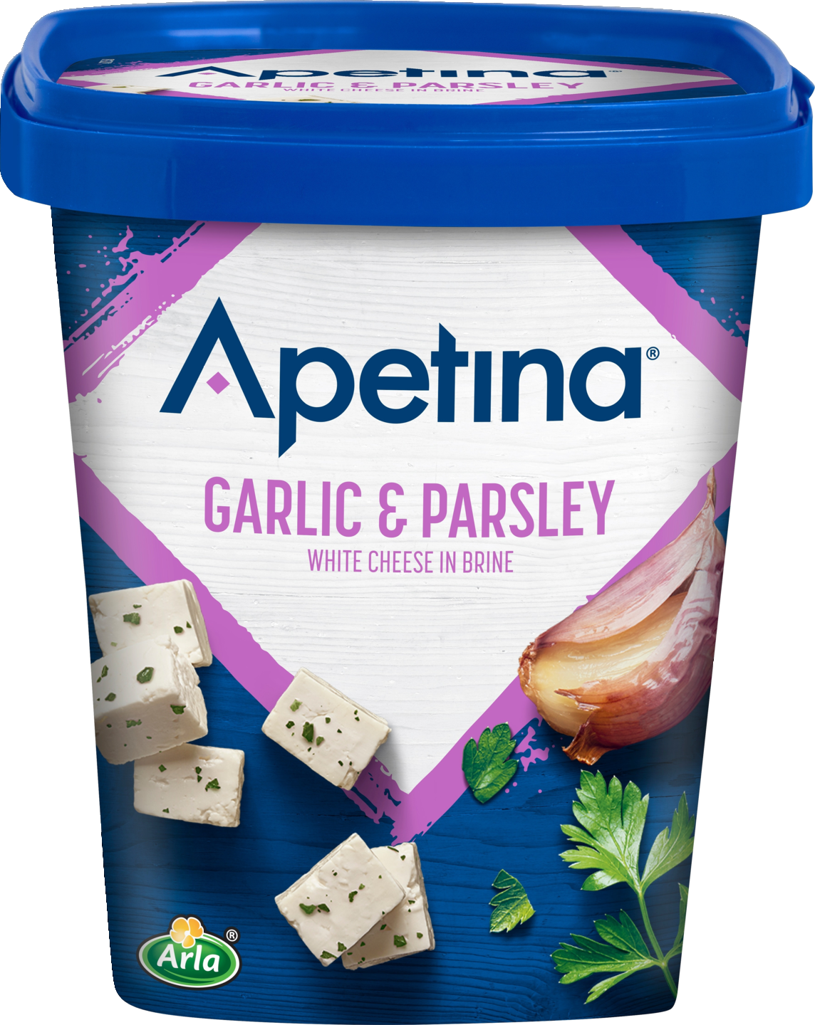 Välimerellistä juustoa kuutioina valkosipulilla ja persiljalla maustetussa suolaliemessä.
