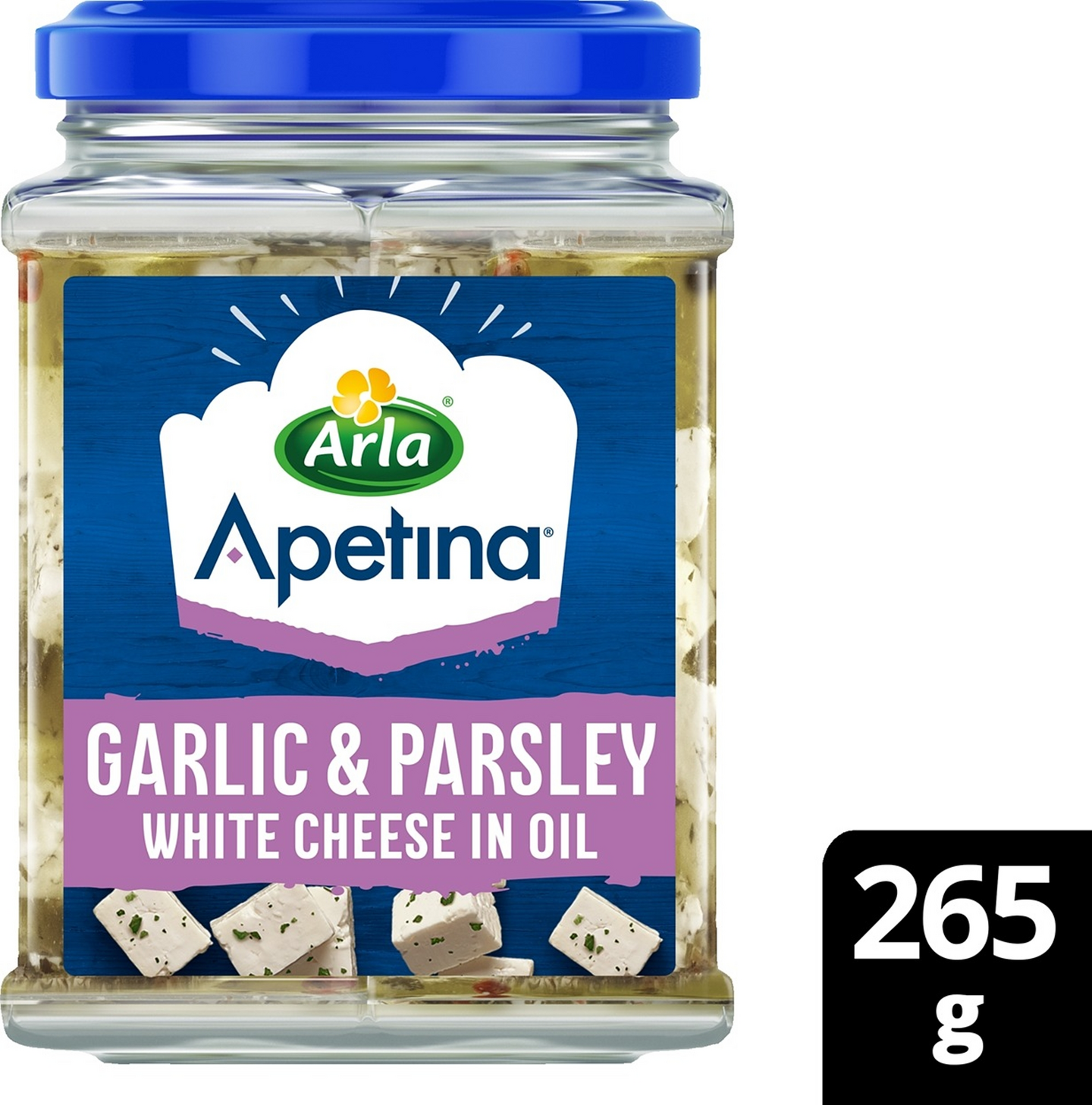 Pehmeitä salaattijuustokuutioita sekä valkosipulia ja persiljaa öljymarinadissa. Vähälaktoosinen.
