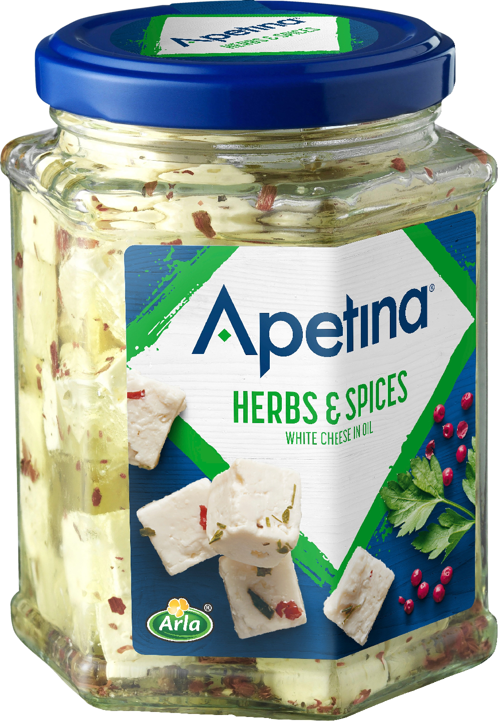 Pehmeää salaattijuustoa maustetussa öljyssä, yrtit ja mausteita. Vähälaktoosinen.