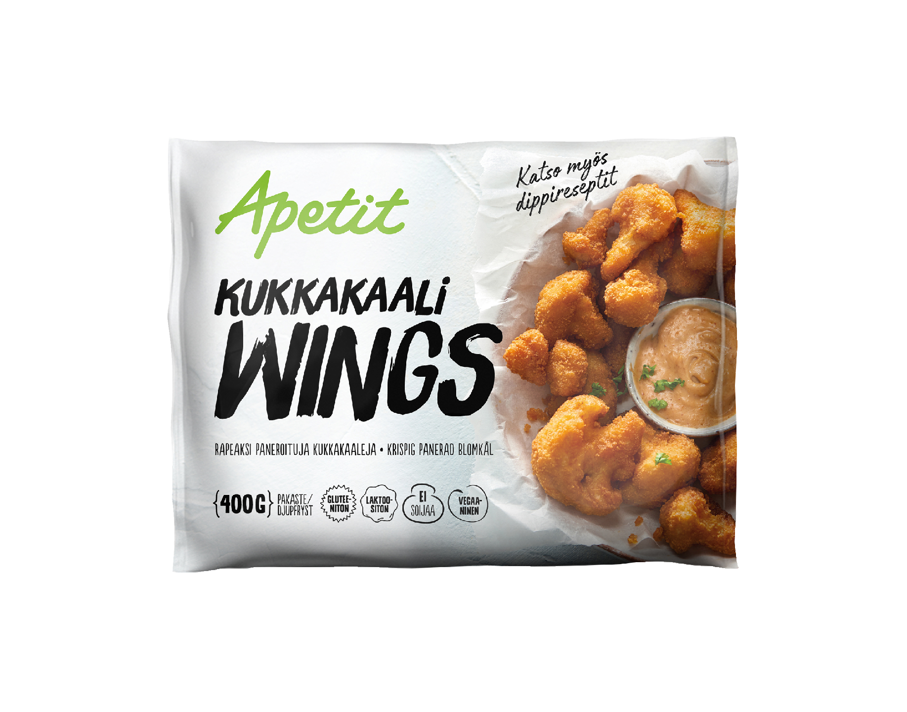 Rapeat, savupaprikalla ja chilillä maustetut vegaaniset ja gluteenittomat Kukkakaaliwingsit ovat täydellinen tuote herkkuhetkiin, naposteltavaksi ja myös lisukkeeksi erilaisiin ruokiin. Niissä on sopivasti mausteisuutta ja tulisuutta. Herkulliset Apetit Kukkakaaliwingsit on kuorrutettu rapealla gluteenittomalla paneerauksella ja ne on maustettu savupaprikalla ja chilillä. Wingsit valmistuvat noepasti uunissa, samalla kun valmistellee muuta ateriaa. Wingsit on loistava tapa tuoda lisää kasviksia osaksi herkuttelua. Helppoa ja hyvää. Kukkakaaliwingsit ovat gluteenittomia, laktoosittomia, maidottomia kananmunattomia ja soijattomia ja soveltuvat vegaaniruokavalioon.