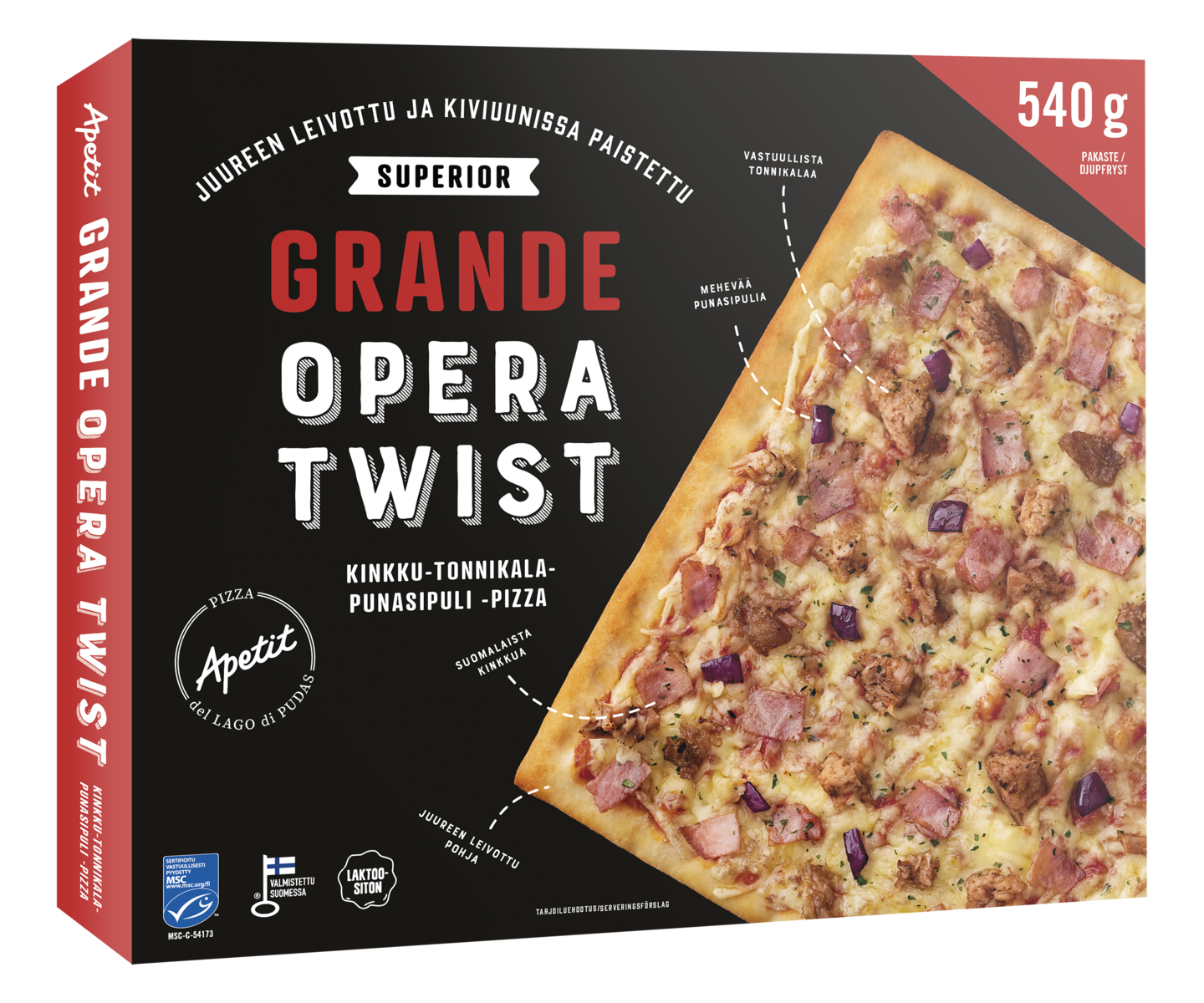 Apetit Superior Grande Opera Twist -pizzassa on herkullista tomaattikastiketta, MSC-sertifioitua tonnikalaa, suomalaista kinkkua, punasipulia sekä kotimaista Karelia- ja Gouda-juustoa. Apetit Superior Grande -pizzat leivotaan juureen ja paistetaan kiviuunissa. Pizzoissa vaalitaan korkeaa laatua, kotimaisia raaka-aineita hyödyntäen. Pizzat valmistetaan Pudasjärvellä, todennäköisesti maailman pohjoisimmassa pizzatehtaassa.