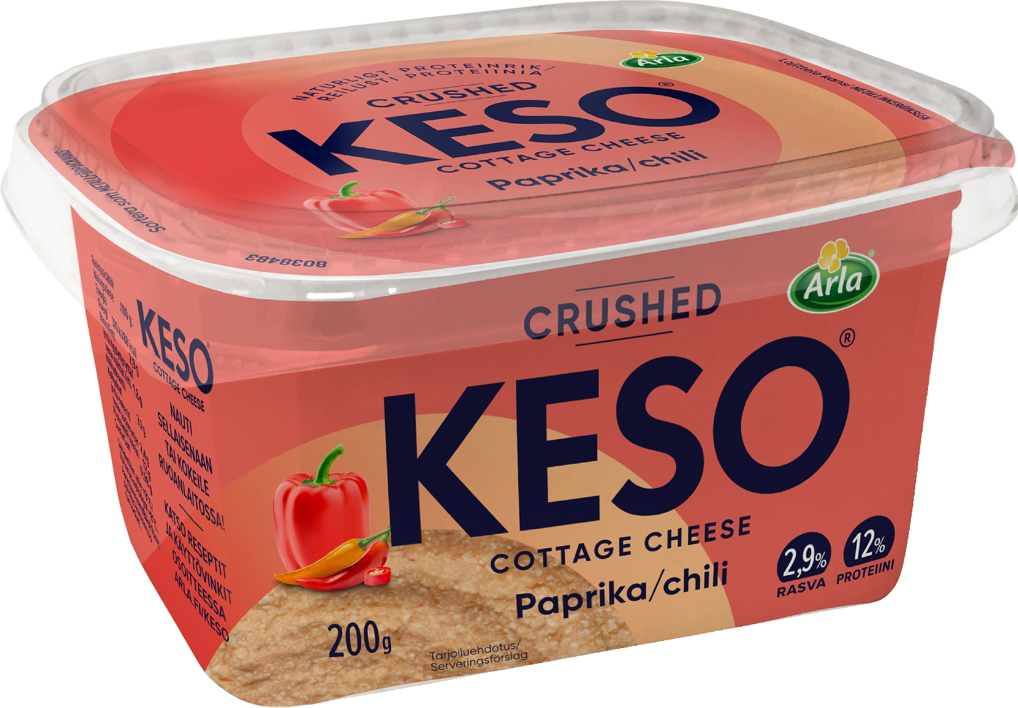 Arla KESO Crushed paprika & chili on maukas yhdistelmä proteiinirikasta raejuustoa ja mausteista makua. Pehmeän koostumuksen ansiosta tuote sopii mainiosti ruoanlaittoon, dipiksi tai leivän päälle. Kokeile esimerkiksi uuniperunan täytteenä, pastakastikkeen joukossa, leivänpäällisenä tai nauti sellaisenaan! Herkulliset reseptit löydät osoitteesta arla.fi/keso.
