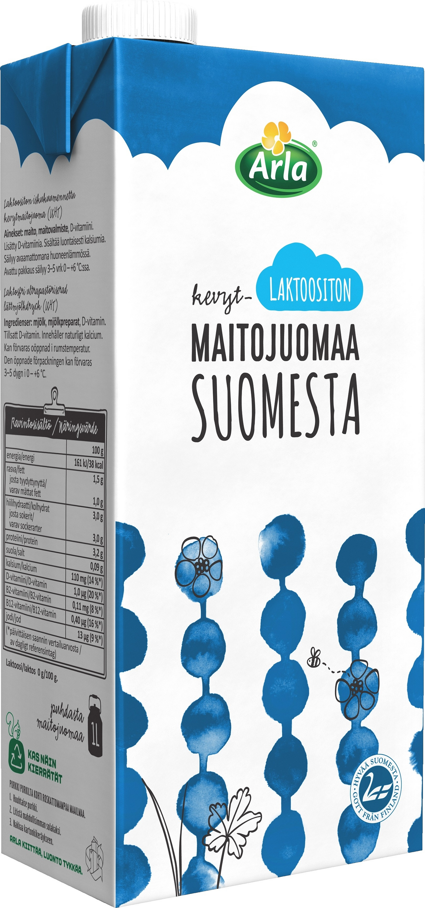 Arla Laktoositonta kevytmaitojuomaa Suomesta (UHT) on valmistettu Suomessa suomalaisesta maidosta. Maitojuoma on monipuolinen ravintoaineiden lähde. Maitojuoma sisältää runsaasti proteiinia ja kalsiumia, jonka imeytymistä parannetaan lisäämällä maitojuomaan D-vitamiinia. UHT laktoosittomassa kevytmaitojuomassa on raikas maidon maku ja sitä voi käyttää tavallisen maidon tapaan juomana, leivonnassa tai ruoanlaitossa. Rasvaa 1,5 %. UHT-maitojuoma voidaan säilyttää avaamattomana huoneenlämmössä, minkä ansiosta se sopiikin hyvin esimerkiksi mökille.