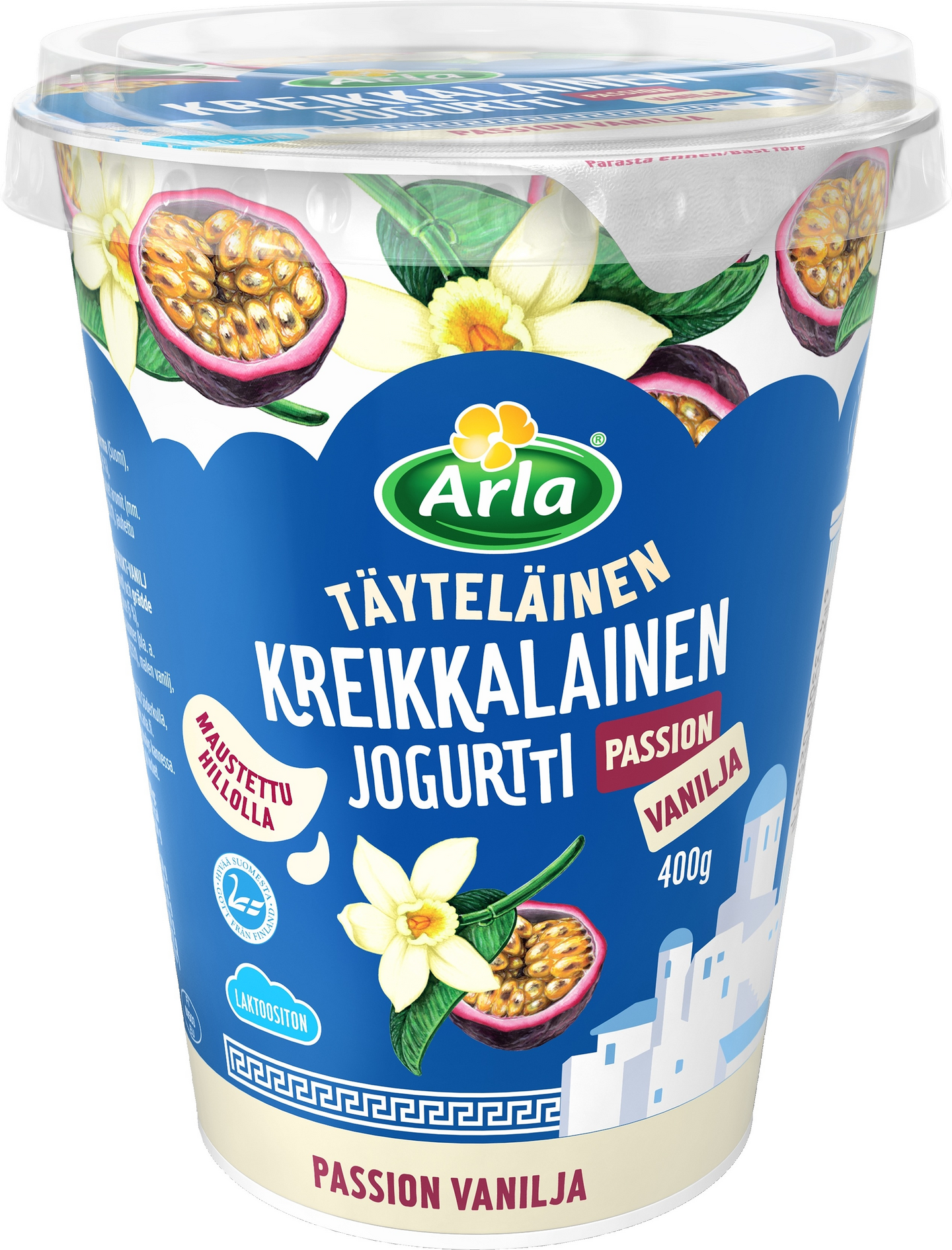 Pehmeän täyteläinen ja laktoositon kreikkalainen jogurtti. Makuna herkullinen passion-vanilja. Suomen Sipoossa tehty, aitoon kreikkalaiseen tyyliin.