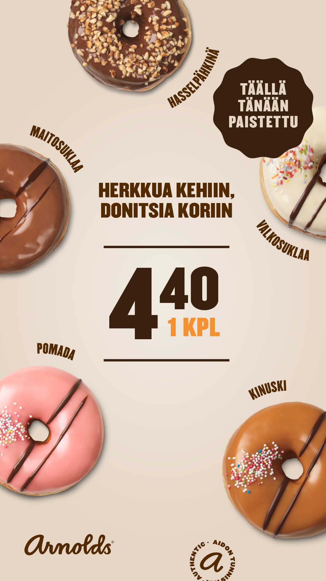 Arnoldsin herkulliset donitsit meiltä! Makuina; Pomada, kinuski, valkosuklaa, maitosuklaa ja hasselpähkinä. Tuotekohtaiseen lisätietoon voitte kirjoittaa haluamanne maut. Donitsit tilauksiin aamulla klo 10 jälkeen.