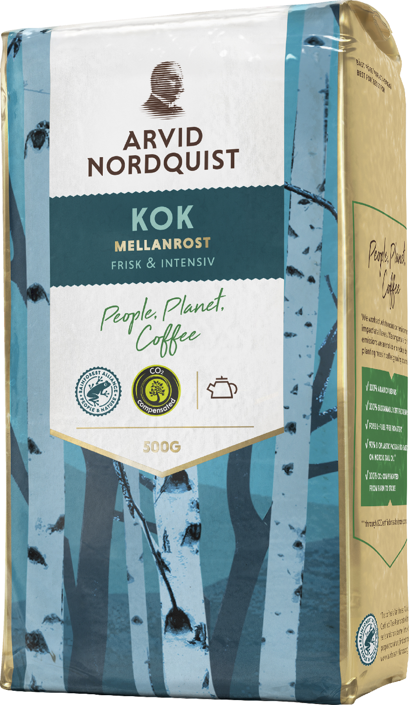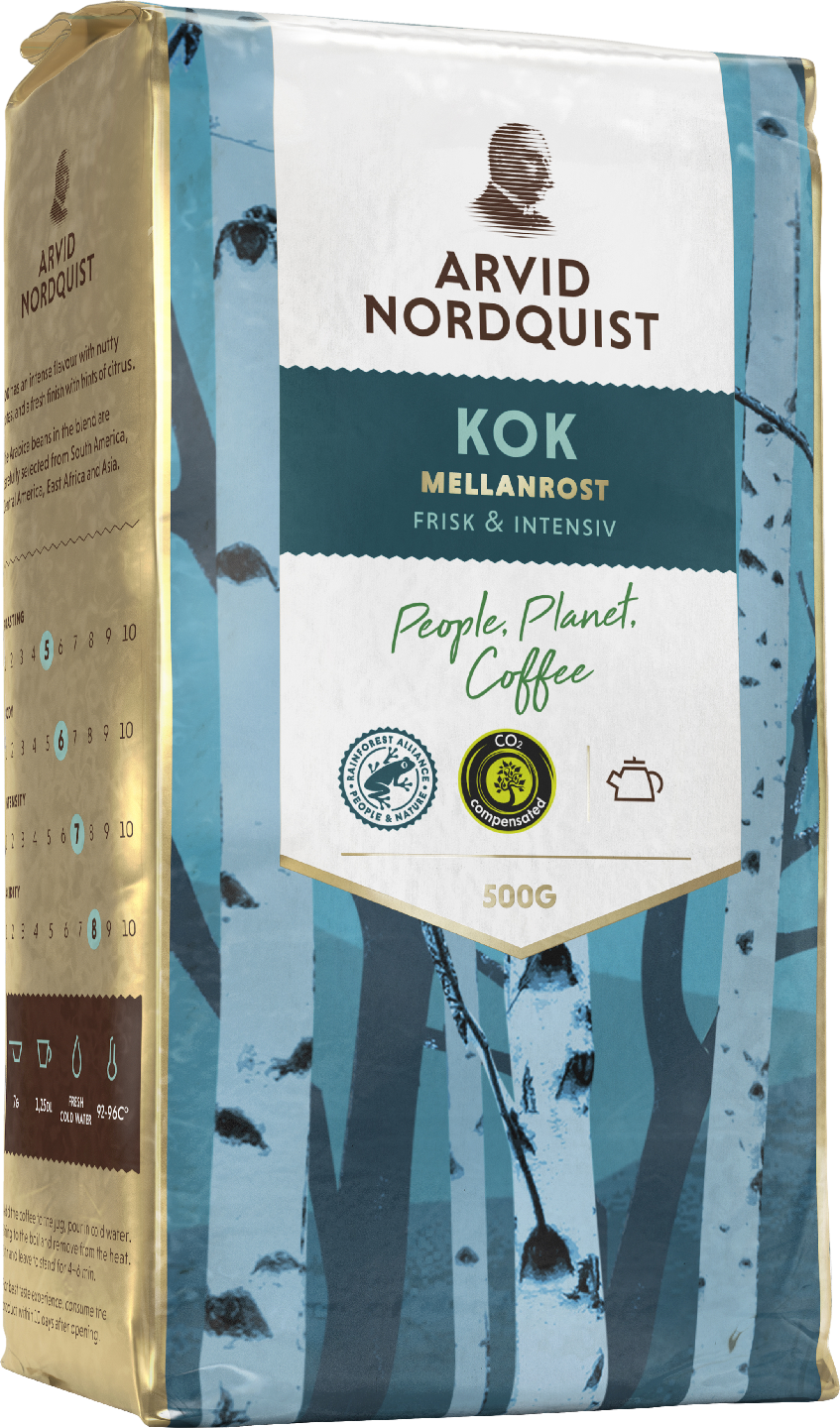 Arvid Nordquist pannukahvi. Kok-kahvin puhtaan intensiivisessä tuoksussa on seetrin, mausteiden ja vivahteikkaan pähkinäisyyden aromeja. Maku on pyöreä, raikas, mustaviinimarjainen ja tasapainoinen. Miedossa jälkimaussa on selkeitä hasselpähkinänä vivahteita.