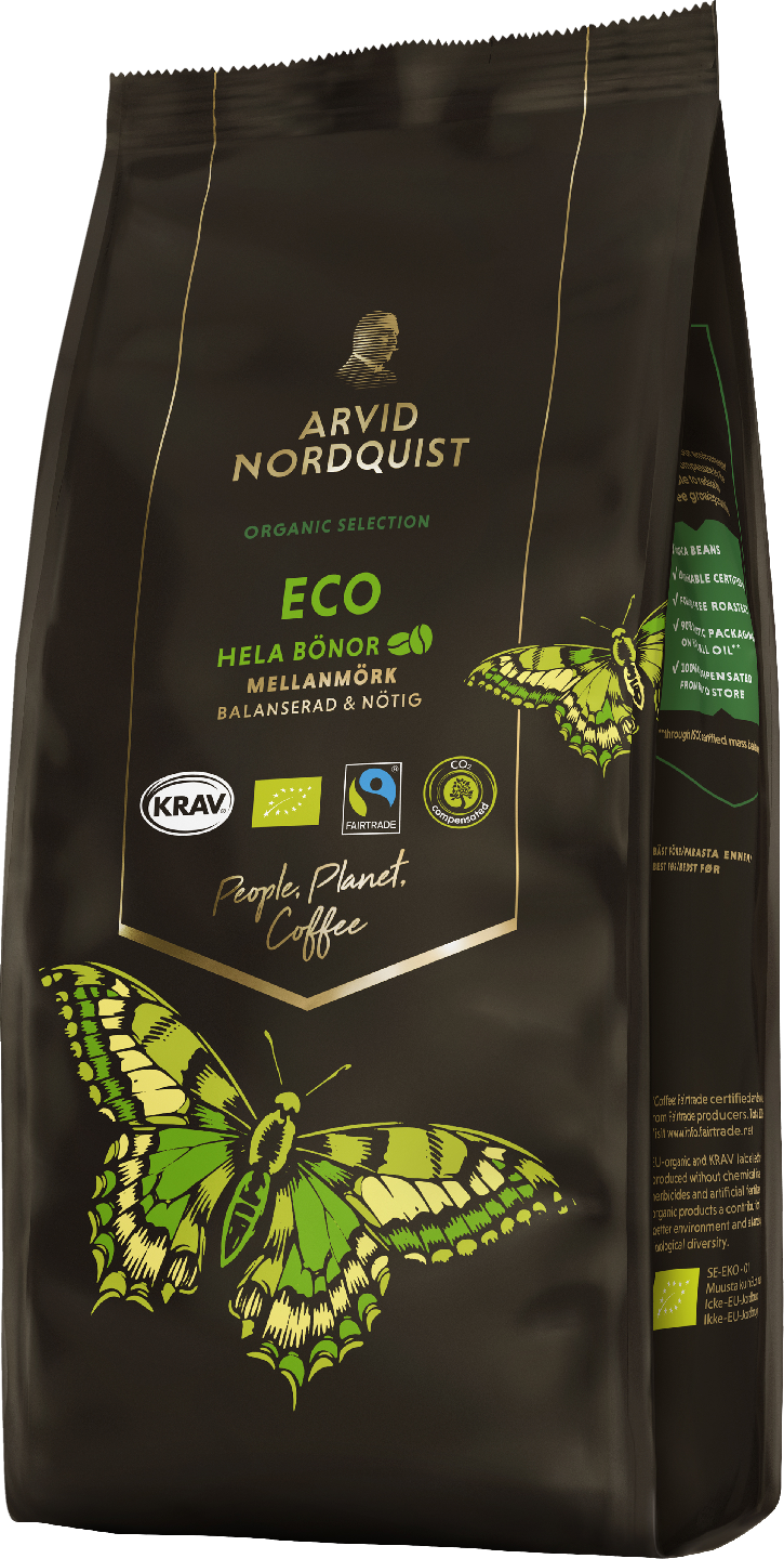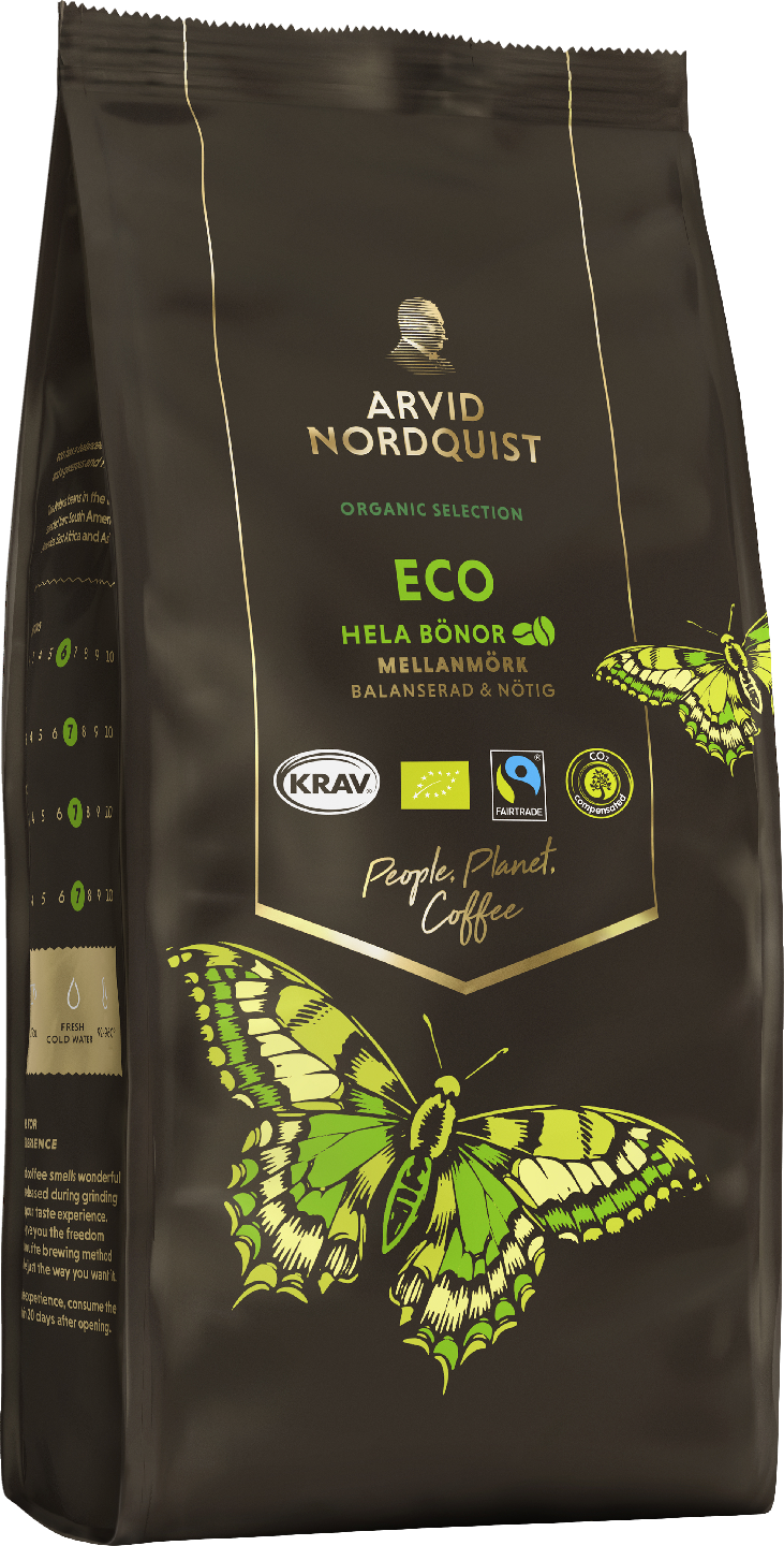 Keskitumma - hedelmäinen ja pähkinäinen Eco on korkealla kasvanut EU-luomumerkitty sekä Reilun kaupan kahvi. Kahvin tuoksu on pyöreä ja runsas, ja siinä on pähkinänougat'n ja vaniljan paahteinen makea aromi. Keskitäyteläinen maku, jossa on mehevää pippurisuutta. Pitkä, tasapainoinen, raikas ja hedelmäinen jälkimaku. Eco sisältää ainoastaan luomuviljeltyjä Arabica-papuja. Kahvitilat, joilla papuja viljellään, ovat KRAV:n sekä Reilun kaupan sertifioimia. Reilun kaupan merkki takaa, että tämä tuote on tuotetttu kansainvälisten Fairtrade-kriteerien mukaisesti. Ostaessasi Reilun kaupan tuotteita myötävaikutat köyhien maanosien tuottajien ja työntekijöiden parempiin työolosuhteisiin ja turvallisempiin sosiaalisin oloihin.
