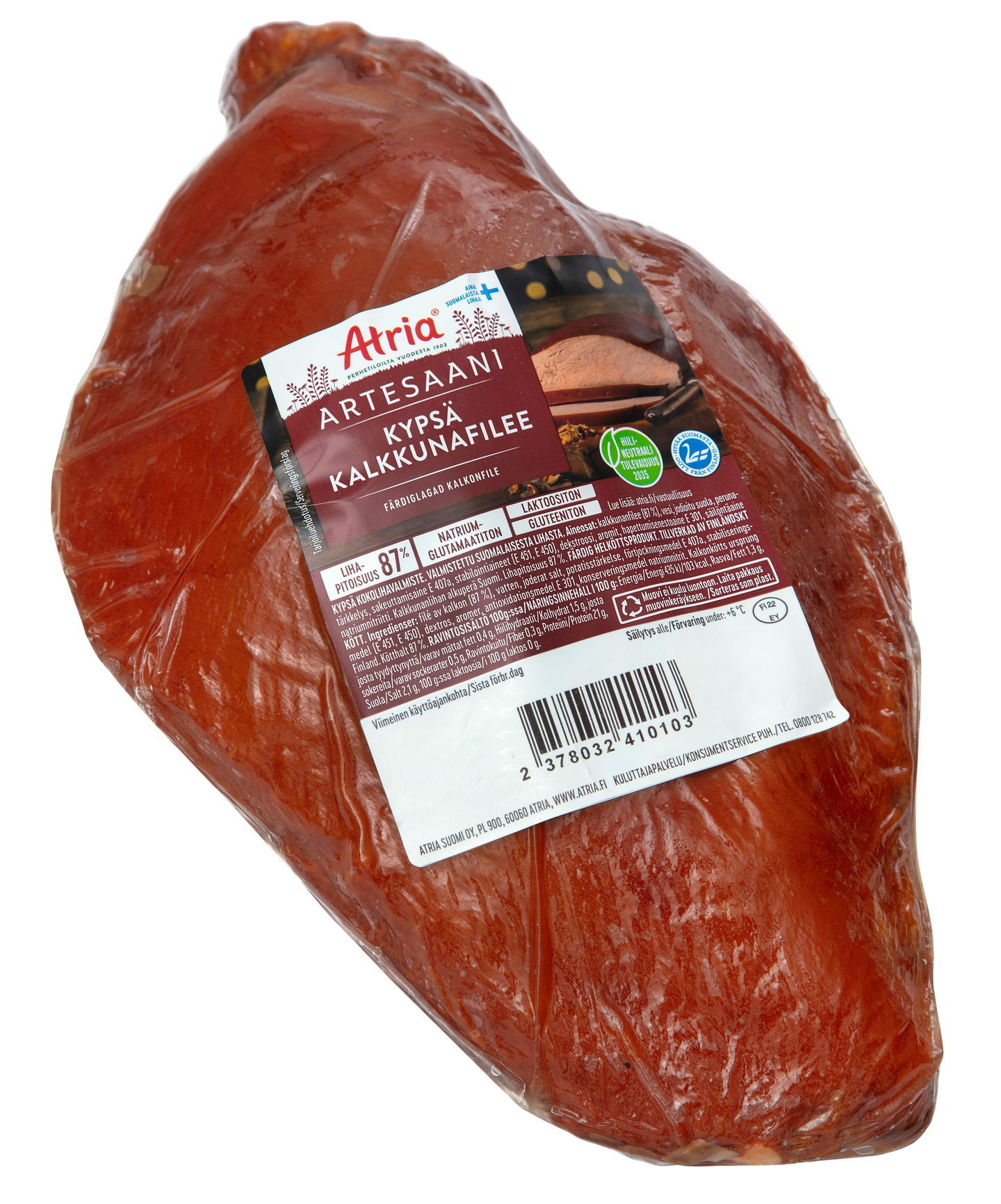 Kokonainen savustettu kalkkunanfilee, valmistettu suomalaisesta kalkkunalihasta. Atria Artesaani joulun ajan tuotteista saa kätevästi rakennettua aikaansa seuraavan ja maukkaan pikkujoulumenun tai näyttävän jouluaterian. Kaikki Atrian tuotteissa käytetty liha on taatusti suomalaista. Eläinten hyvinvoinnista huolehditaan valvotusti Atrian koko ruokaketjussa. Yksittäisen tuotteen keskimääräinen paino on 900 g.