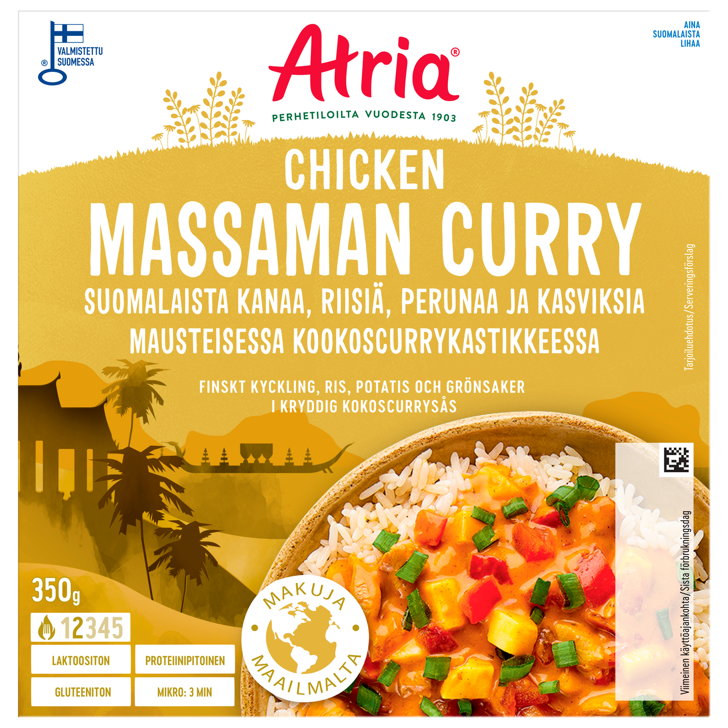 Atria Massaman Curry 350g vie makumatkalle Thaimaalaiseen fuusiokeittiöön. Herkullinen ateria valmistetaan suomalaisesta kanasta, mausteisesta kookoscurrykastikkeesta, perunasta, kasviksista ja riisistä. Massaman Curry on mukavan mausteinen ateria vaikka lounaaksi töissä.