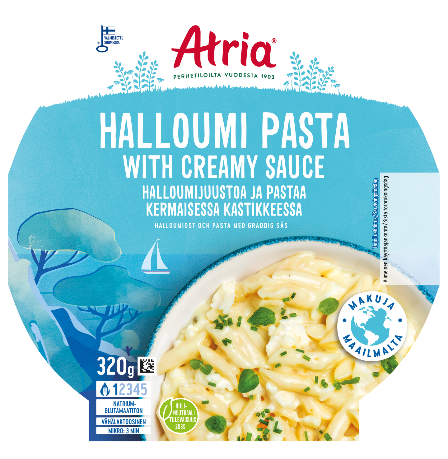 Halloumi Pasta vie sinut makumatkalle Kyprokselle. Atria Halloumi Pasta with Creamy Sauce on valmistettu herkullisesta halloumijuustosta, Minipenne-pastasta ja kermaisesta kastikkeesta. Atria Halloumi Pasta on maukas ja täyteläinen valmisateria, jonka lämmität kätevästi mikroaaltouunissa. Halloumi Pasta on vähälaktoosinen eikä se sisällä natriumglutamaattia. Halloumi Pasta on juuston ystävän herkku, jota voit tuunata lisäämällä aterian päälle yrttejä ennen tarjoilua.