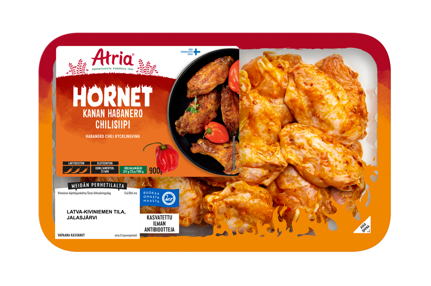 Atria Kana Hornet habanero-marinoidut siivet ovat herkullista ja helppoa sormiruokaa. Atria Hornet kanansiivet ovat suomalaista kanaa. Siipien kanssa maistuvan kokonaisuuden luo pilkotut kasvikset, kuten porkkanat, paprikat, kurkut tai varsisellerit. Lisäksi voit tehdä niin kanansiiville, kuin kasviksille oman dipin täydentämään jo herkullista makumaailmaa. Ota siivet huoneenlämpöön ½ tuntia ennen kypsentämistä. Levitä siivet tasaisesti uunipellille leivinpaperin päälle ja paista 250°C tasalämpöuunissa n. 25 min, kunnes sisälämpötila on 75°C. Siivistä saa mukavan rapeita pinnasta, kun ne asettelee uunipellille hieman erilleen toisistaan.Näin siivet myös kypsyvät tasaisemmin. Antibioottivapaa-merkintä pakkauksessa kertoo, että eläimet eivät ole tarvinneet ainuttakaan antibioottikuuria elämänsä aikana.