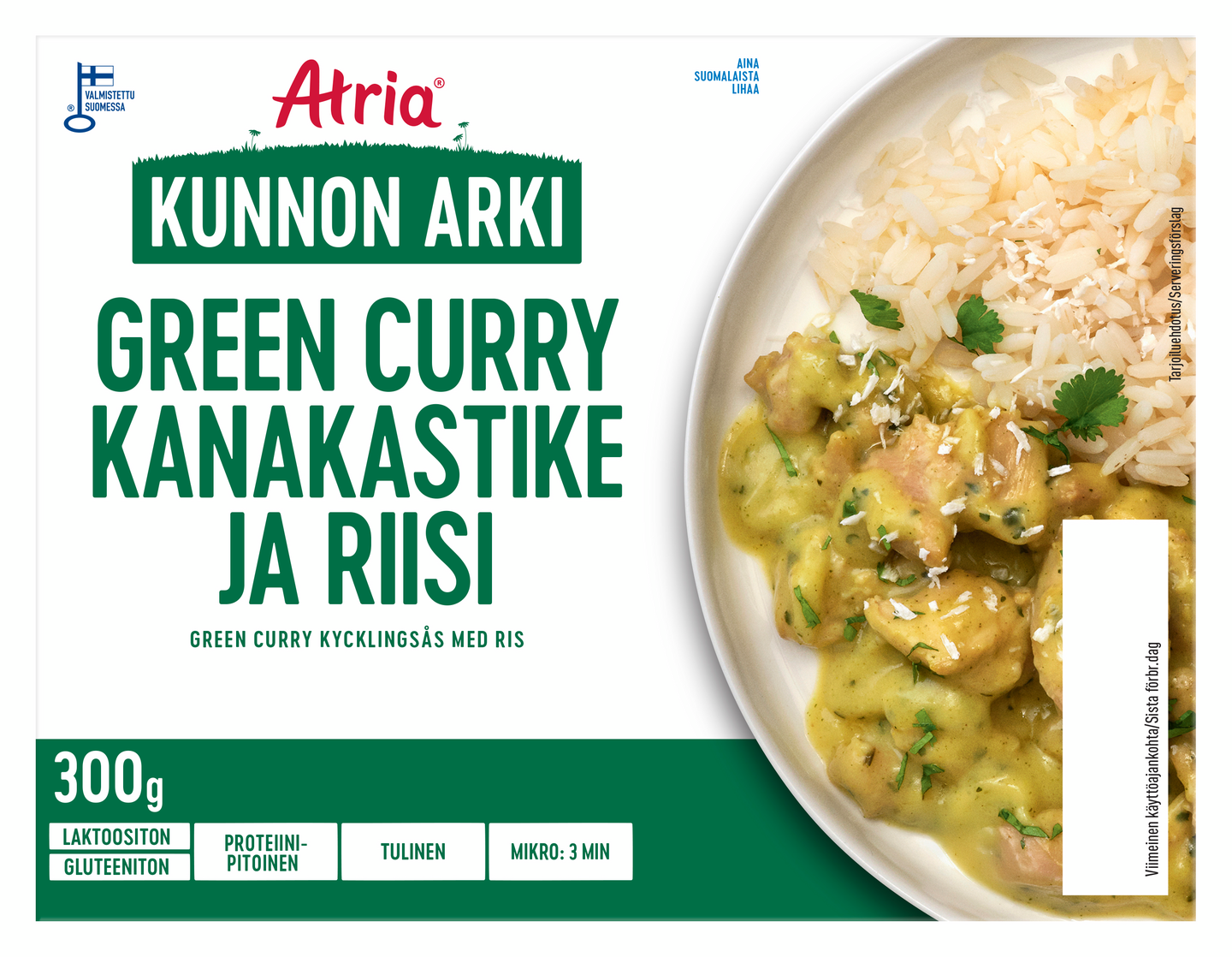 Green Curry Kanakastike ja Riisi tuo arkipäivään maukkaan tujauksen kiehtovaa kookosta, kutkuttavaa vihreää currya ja suomalaista kanaa. Atrian Kunnon Arki -sarjan Green Curry Kanakastike on valmistettu suomalaisesta broilerista. Vihreä Curry kanakastike ja riisi on maukas valmisateria, jonka lämmität kätevästi mikroaaltouunissa. Valmisruoka helpottaa kiireistä arkea ja kulkee siististi pakattuna esimerkiksi evääksi työpaikalle. Tarjoile Green Curry kanakastike -ateria tuoreiden tomaatti- ja kurkkulohkojen kera.