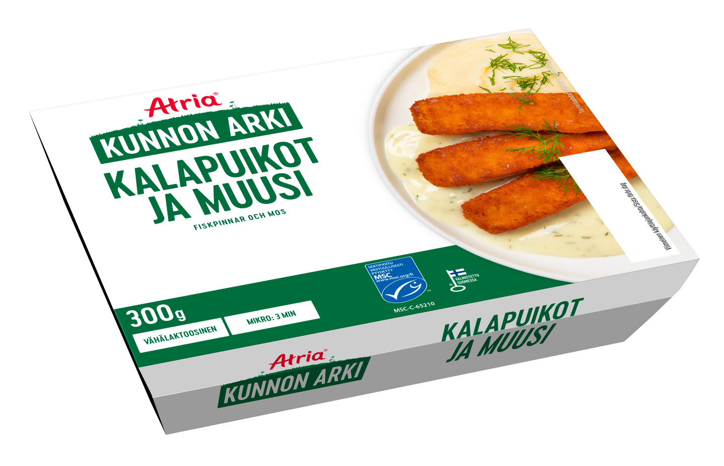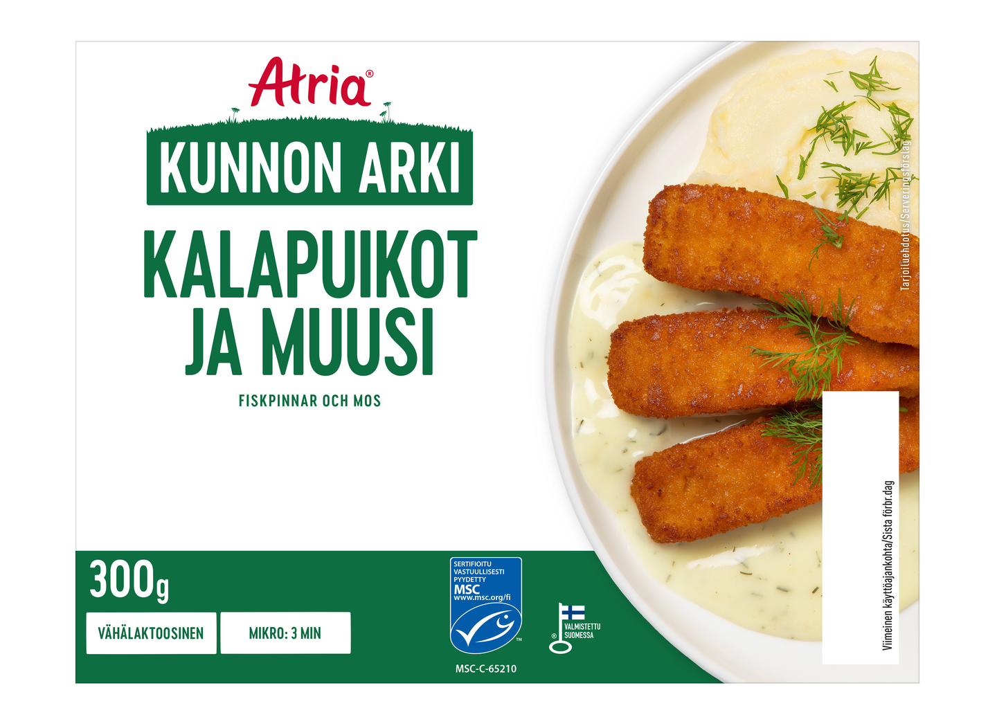 Atria Kunnon Arki Kalapuikot ja Muusi 300g on kaikkien aikojen suosituin kouluruoka kätevästi yhden hengen mikroateriana. Kalapuikkojen kaverina on muusia ja vaaleaa, miedon makuista tillikastiketta. Annos valmistettu on MSC-sertifioidusta kalasta. Pakkauksen voi kierrättää muovinkeräykseen ja holkin kartonkikeräykseen. Lämmitys helposti mikrossa.