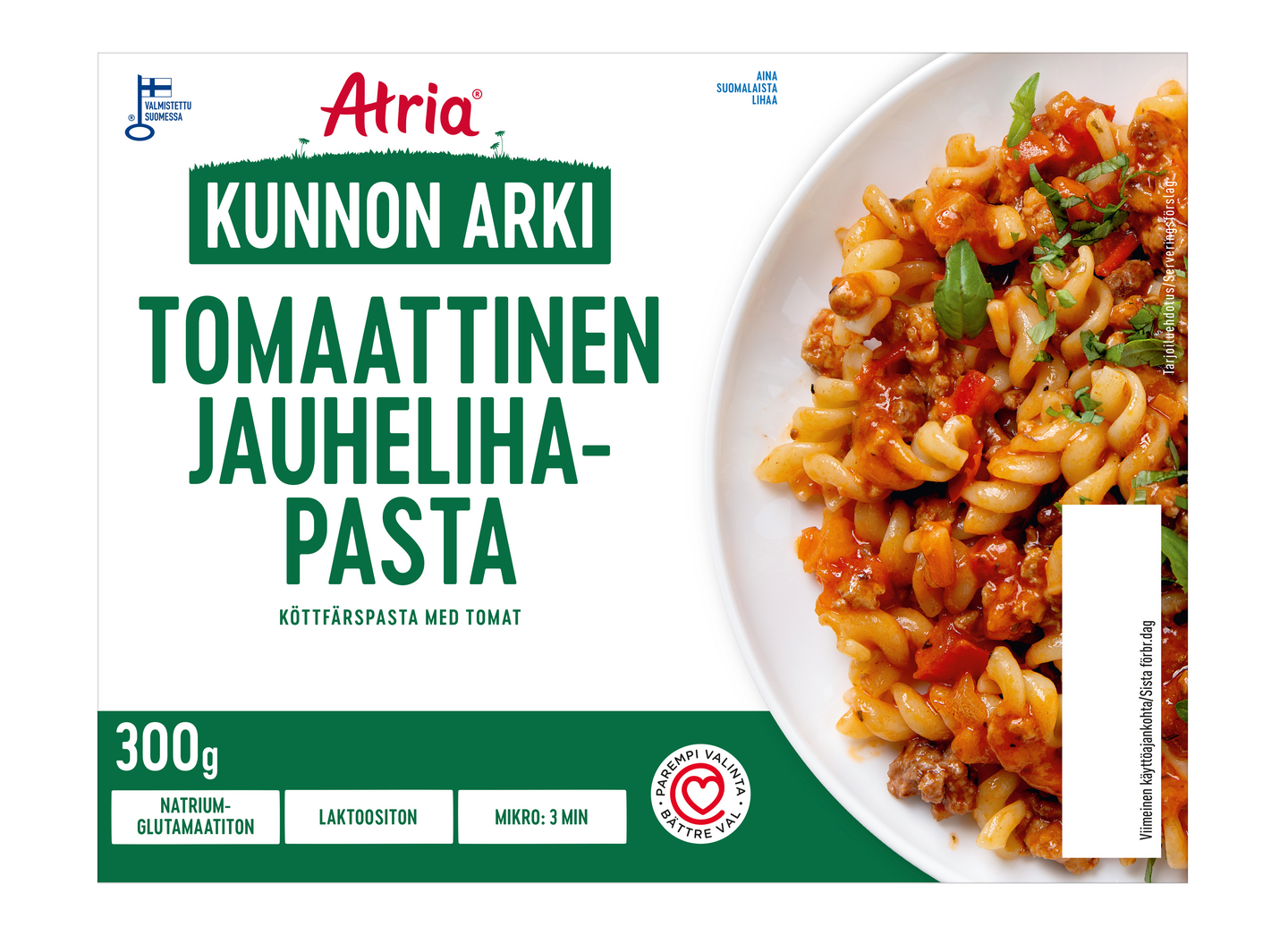 Tomaattinen jauhelihapasta on maukas mikroateria koko perheen makuun. Se on terveellisempi vaihtoehto, mistä kertoo myös sydänmerkki. Atrian Kunnon Arki Tomaattisessa Jauhelihapastassa maistuvat jauheliha, yritit, ripaus sipulia ja mausteita, herkullinen pasta ja maukas tomaattikastike. Tomaattisen Jauhelihapastan lisukkeeksi sopii raikas salaatti tai kurkkusiivut. Valmis mikroateria on helpotus kiireiseen arkeen. Se toimii myös siististi pakattuna lounaana, jonka voi ottaa mukaan esimerkiksi työpaikalle. Lämmitetyn Tomaattisen Jauhelihapastan voi halutessaan tuunata tuoreilla yrteillä, esimerkiksi basilikanlehdillä.