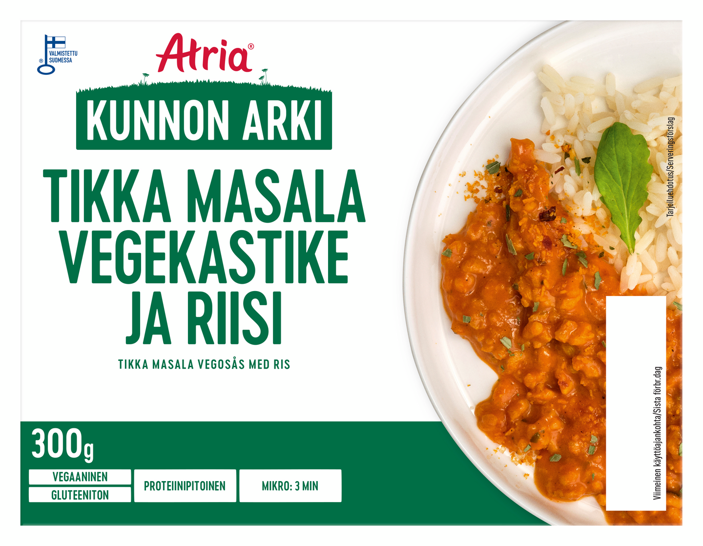 Tikka Masala Vegekastike ja Riisi tuo arkipäivään maukkaan tujauksen kiehtovaa kookosta ja kutkuttavia intialaisvivahteita vegaanisena. Atrian Kunnon Arki - Sarjan Tikka Masala Vegekastike ja riisi on valmistettu herneproteiinista ja on maukas arkiruoka, jonka lämmität kätevästi mikroaaltouunissa. Ateria helpottaa kiireistä arkea ja kulkee siististi pakattuna esimerkiksi evääksi työpaikalle. Tarjoile Tikka Masala Vegekastike -ateria tuoreen vihersalaatin kera.
