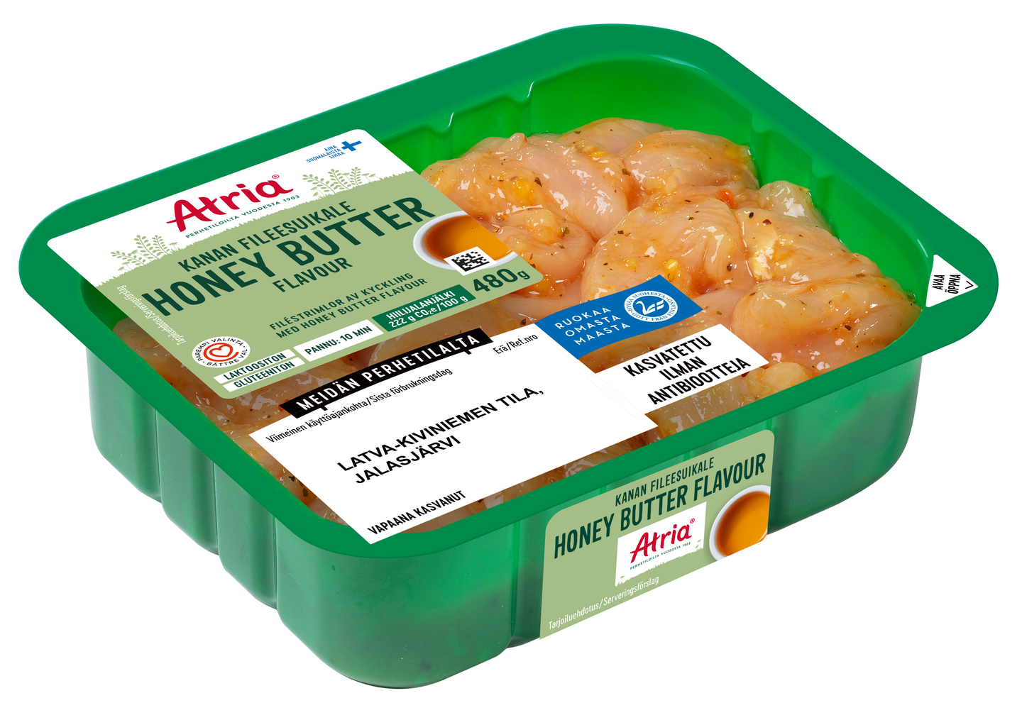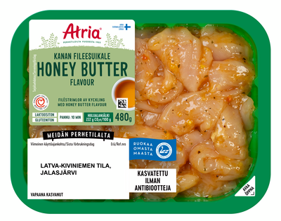 Honey Butter -marinoitu kanan fileesuikale on valmiiksi maustettu ja helppo valmistaa. Honey butter on hunajan ja voin makuinen ja toimii monessa ruuassa. Voit valmistaa honey butter -marinoidut kanan fileesuikaleet paistamalla sellaisenaan tai tekemällä kastiketta esimerksiksi herkulliseen kanapastaan. Kun valmistat marinoituja fileesuikaleet, ota ne huoneenlämpöön ½ tuntia ennen kypsentämistä. Ruskista kuumalla pannulla tilkassa öljyä n. 2 min ja hauduta 6 - 8 min kypsäksi. Antibioottivapaa-merkintä pakkauksessa kertoo, että eläimet eivät ole tarvinneet ainuttakaan antibioottikuuria elämänsä aikana.