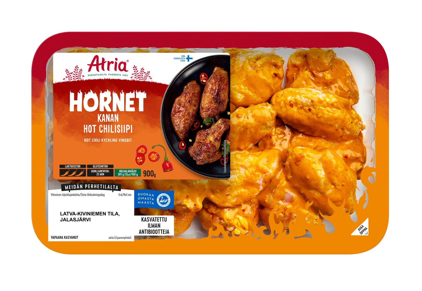 Atria Hornet Hot Chili tulisesti marinoidut siivet on helppo tapa valmistaa uunissa sormiruokaa. Siipien kanssa maistuvan kokonaisuuden täydentää pilkotut kasvikset, kuten porkkanat, paprikat, kurkut ja varsisellerit. Lisäksi voit tehdä kanansiiville oman dipin täydentämään jo herkullista makumaailmaa. Ota siivet huoneenlämpöön ½ tuntia ennen kypsentämistä. Levitä siivet tasaisesti uunipellille leivinpaperin päälle ja paista 250°C tasalämpöuunissa n. 25 min, kunnes sisälämpötila on 75°C. Siivistä saa mukavan rapeita pinnasta, kun ne asettelee uunipellille hieman erilleen toisistaan. Antibioottivapaa-merkintä pakkauksessa kertoo, että eläimet eivät ole tarvinneet ainuttakaan antibioottikuuria elämänsä aikana.