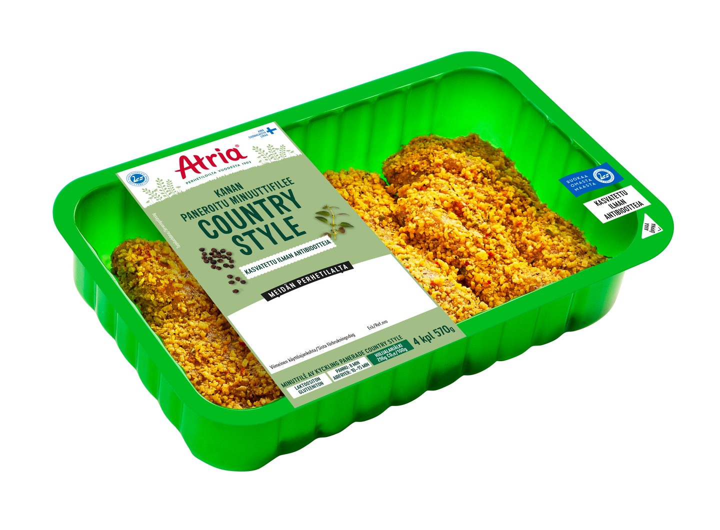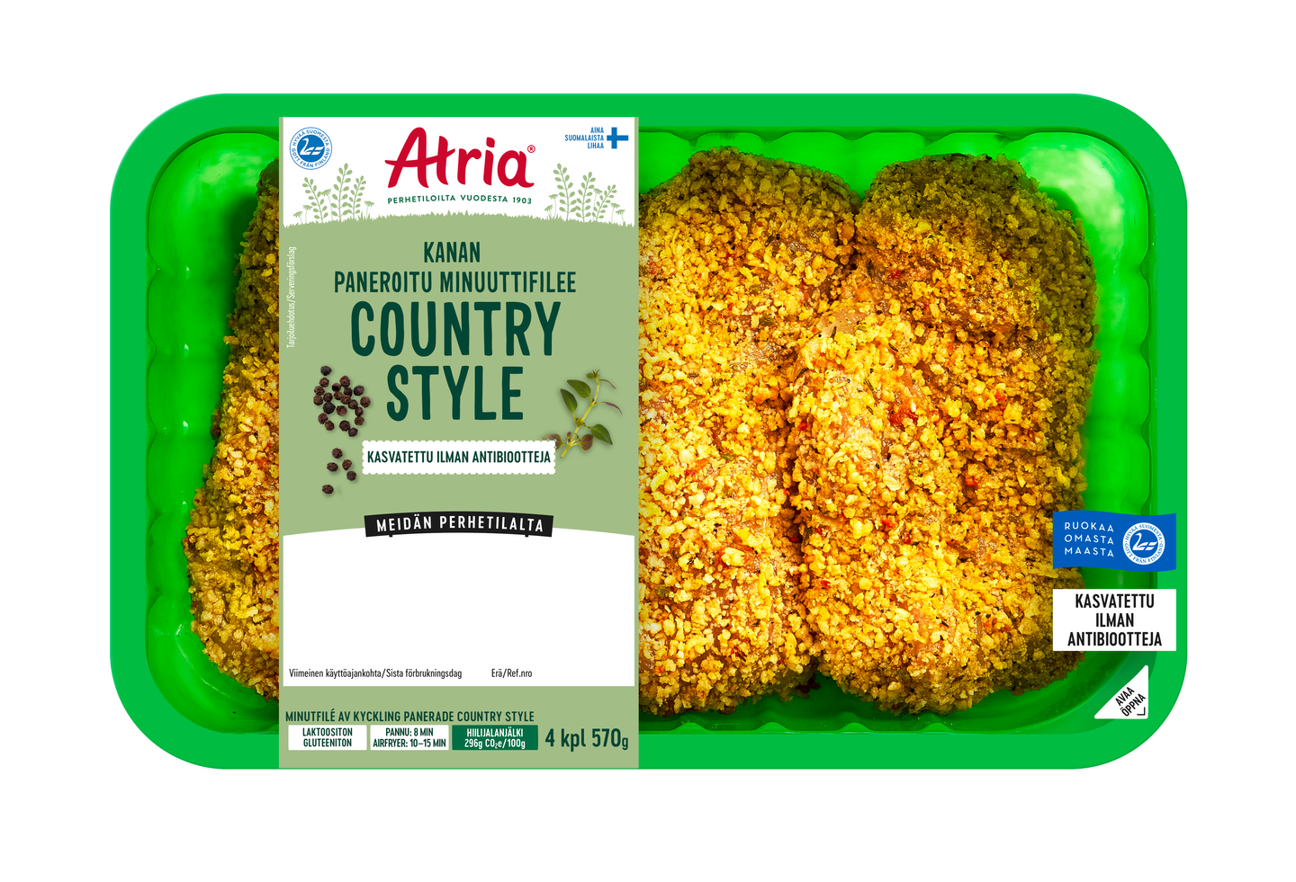 Atria kanan paneroitu minuuttifilee sopii todella moneen kanaruokaan. Valmistat kanan fileeleikkeet parhaiten ottamalla ne huoneenlämpöön ½ tuntia ennen kypsentämistä. Paista kuumalla pannulla runsaassa öljyä yhteensä n. 10 min välillä kääntäen. Antibioottivapaa-merkintä pakkauksessa kertoo, että eläimet eivät ole tarvinneet ainuttakaan antibioottikuuria elämänsä aikana.