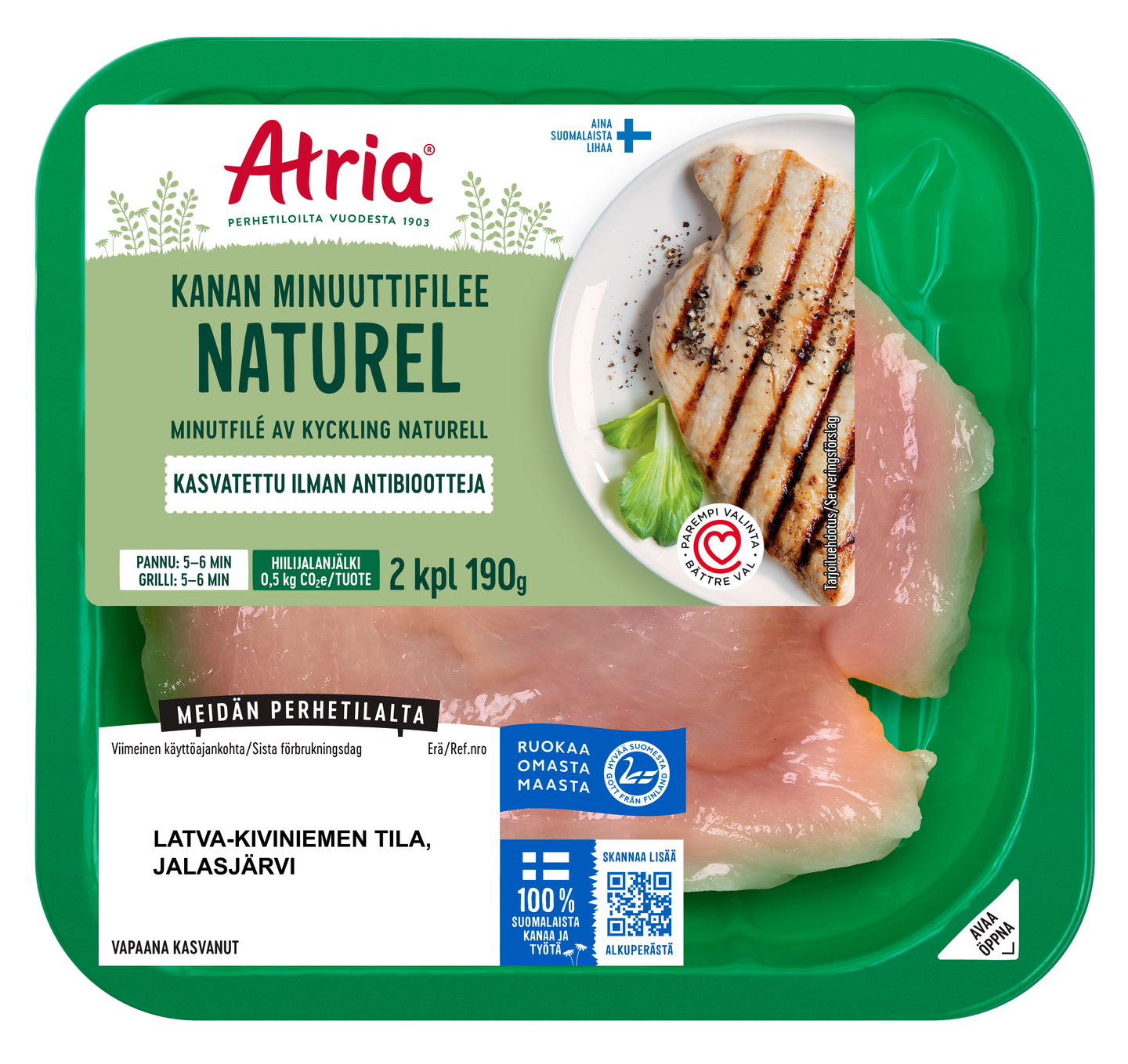 Maustamaton Atria Kanan Minuuttifilee sopii todella moneen kanaruokaan. Minuuttifilee sopii herkullisiin kastikkeisiin tai fajitaksiin ja tortilloihin. Kypsennyksen jälkeen viilennettynä sopii myös mainiosti salaatin joukkoon. Kana on erinomainen grilliherkku ja toimii yhteen hyvin esimerkiksi maissin kanssa tarjoiltuna. Antibioottivapaa-merkintä pakkauksessa kertoo, että eläimet eivät ole tarvinneet ainuttakaan antibioottikuuria elämänsä aikana.