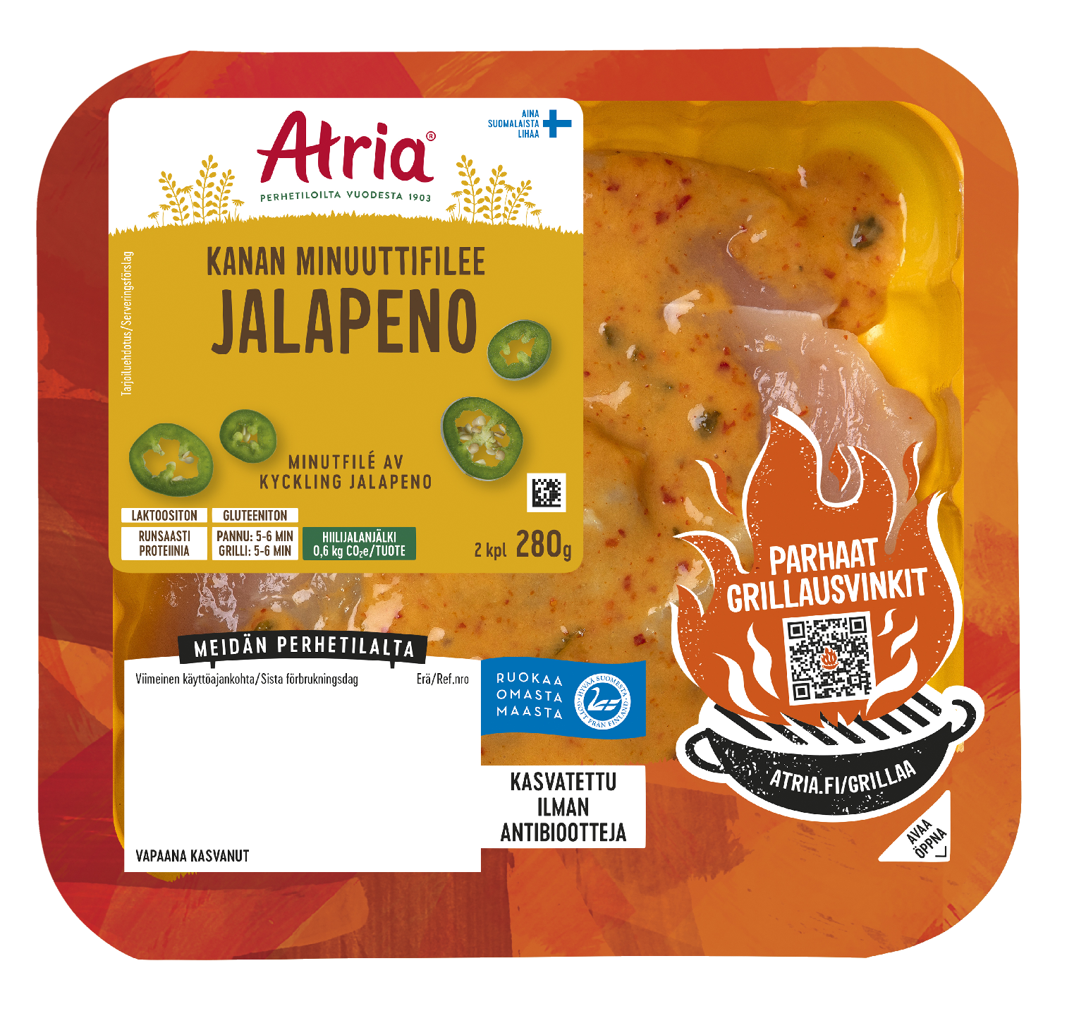Atria Kanan Minuuttifilee Jalapeno sopii todella moneen kanaruokaan. Kypsennyksen jälkeen viilennettynä sopii myös mainiosti salaatin joukkoon. Kana on erinomainen grilliherkku ja toimii yhteen hyvin esimerkiksi maissin tai vihannesvartaitten kanssa tarjoiltuna. Valmistat kanan fileeleikkeet parhaiten ottamalla ne huoneenlämpöön ½ tuntia ennen kypsentämistä. Grillaa tai paista kuumalla pannulla tilkassa öljyä yhteensä n. 10 min välillä kääntäen. Antibioottivapaa-merkintä pakkauksessa kertoo, että eläimet eivät ole tarvinneet ainuttakaan antibioottikuuria elämänsä aikana.