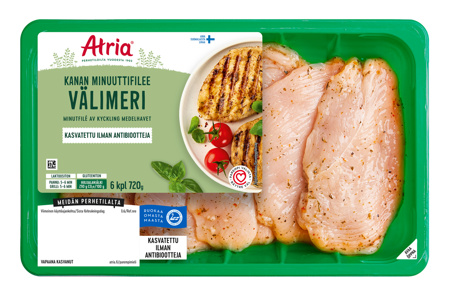Atria Kanan Minuuttifilee Välimeri sopii todella moneen kanaruokaan. Kanan Minuuttifilee on erinomainen grilliherkku ja sopii yhteen hyvin esimerkiksi maissin tai vihannesvartaitten kanssa tarjoiltuna. Kypsennyksen jälkeen viilennettynä sopii myös mainiosti salaatin joukkoon. Valmistat kanan fileeleikkeet parhaiten ottamalla ne huoneenlämpöön ½ tuntia ennen kypsentämistä. Grillaa tai paista kuumalla pannulla tilkassa öljyä yhteensä n. 10 min välillä kääntäen. Antibioottivapaa-merkintä pakkauksessa kertoo, että eläimet eivät ole tarvinneet ainuttakaan antibioottikuuria elämänsä aikana.