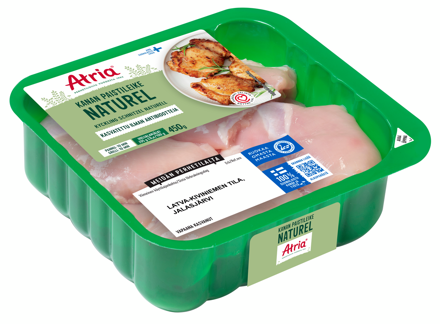 Atria maustamaton kanan paistileike on erinomainen raaka-aine moneen eri ruokaan. Paistileikkeen voi kypsentää helposti pannulla, uunissa tai grillissä. Paistileikkeet kannattaa ottaa huoneenlämpöön ½ tuntia ennen kypsentämistä. Grillaa tai paista kuumalla pannulla tilkassa öljyä yhteensä n. 14 min välillä kääntäen, kunnes sisälämpötila on 75°C. Paistileikkeen valmistus kestää hieman pidempään, koska se on esimerkiksi ohutta fileeleikettä paksumpi pala. Antibioottivapaa-merkintä pakkauksessa kertoo, että eläimet eivät ole tarvinneet ainuttakaan antibioottikuuria elämänsä aikana.