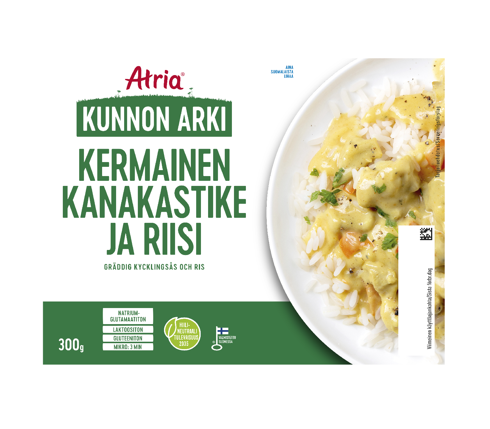 Kermainen kanakastike ja riisi on herkullinen arkiruoka, joka maistuu myös lapsille ja nuorille. Atrian Kunnon Arki -sarjan kermainen kanakastike on valmistettu suomalaisesta broilerista. Kermainen kanakastike ja riisi on maukas valmisateria, jonka lämmität kätevästi mikroaaltouunissa. Valmisruoka helpottaa kiireistä arkea ja kulkee siististi pakattuna esimerkiksi evääksi työpaikalle. Tarjoile kermainen kanakastike -ateria tuoreiden tomaatti- ja kurkkulohkojen kera.