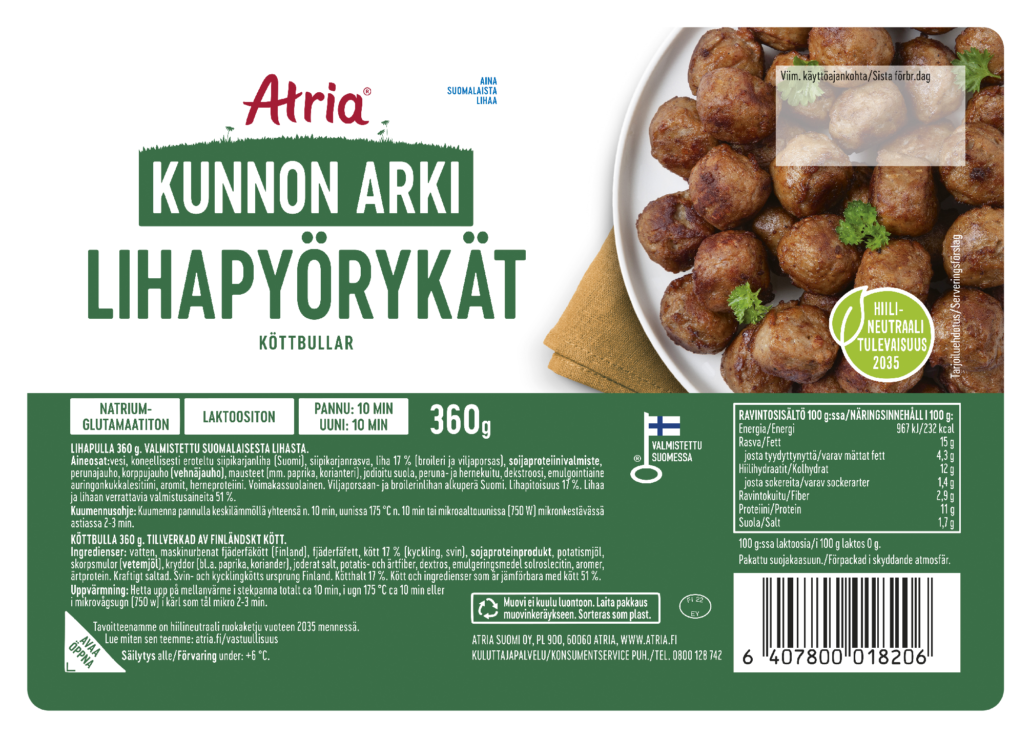 Lihapyörykät ovat suosittu arkiruoka, joka sopii koko perheen makuun. Atrian Kunnon Arki -sarjan lihapyörykät ovat valmistettu kotimaisesta lihasta. Tarjoile lihapyörykät perinteisesti esimerkiksi perunamuusin tai keitettyjen perunoiden ja salaatin kanssa. Lihapyörykät ovat herkullisia sellaisenaan, mutta sopivat myös osaksi toista ruokalajia. Tomaattinen lihapyörykkäkastike sointuu spagetin kanssa tarjottavaksi. Lihapyöryköistä voi myös tehdä maukkaan lihapyörykkäkeiton.