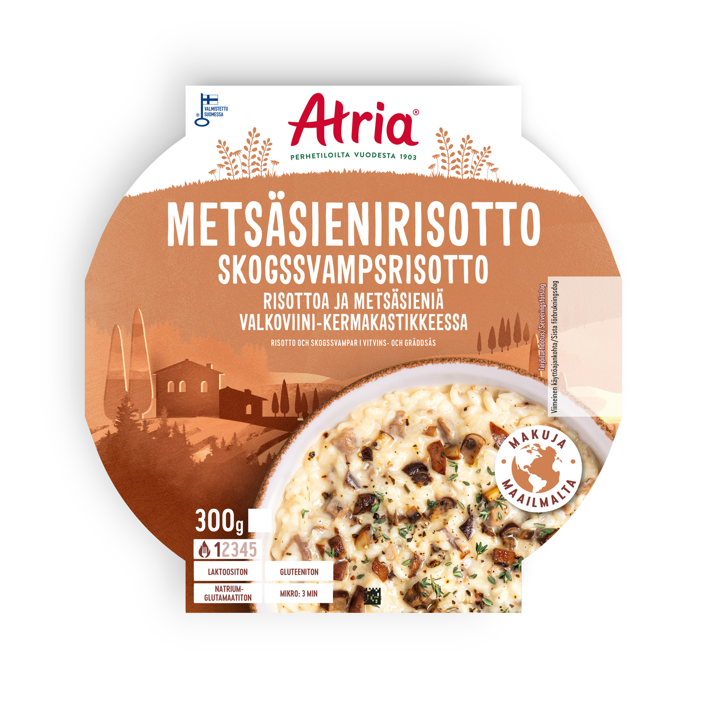 Atria Metsäsieni Risotto on todellinen helpotus risottojen ystävälle. Risotto on valmiiksi kypsäksi haudutettu herkku, jossa metsäsienet rakentavat maun ja valkoviini viimeistelee täyteläisen makuelämyksen. Metsäsienirisotto on laktoositon, gluteeniton ja sopii kasvisruokavalioon. Risottoaterian lämmität kätevästi mikroaaltouunissa. Pakkaus on täysin kierrätettävä muovinkeräykseen ja kartonkikeräykseen.