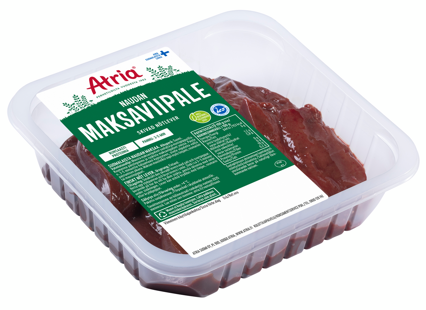 Naudan maksa on herkkujen herkku. Mausta valmiiksi viipaloidut maksapihvit oman maun mukaan ja paista pannulla kypsäksi. Maksapihvien valmistaminen ei tämän helpommaksi muutu.Liha on peräisin suomalaisilla Atrian perhetiloilla kasvatetusta nurmella ruokitusta naudasta. Yksittäisen tuotteen keskimääräinen paino on 400 g.