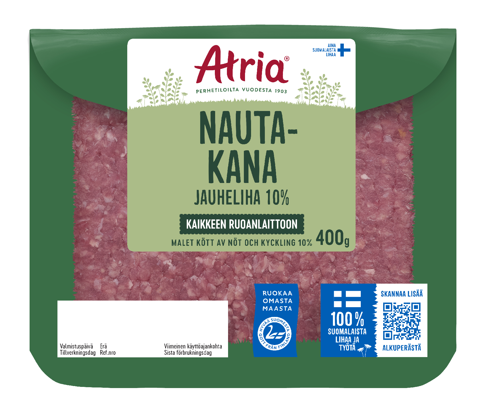 Atrian nauta-kana jauheliha sisältää 60% naudanlihaa ja 40% kanaa. Jauheliha saa makunsa naudasta ja kana tuo jauhelihaan keveyttä. Nauta-kana jauheliha on monikäyttöinen helppo jauheliha joka sopii kaikkeen ruuanlaittoon. Tuotteen rasvapitoisuus on 10% ja se tuo juuri sopivasti makua monelaisiin jauheliharuokiin ja soveltuu mainiosti niin arkikäyttöön kuin erityisempiin ruokahetkiin.