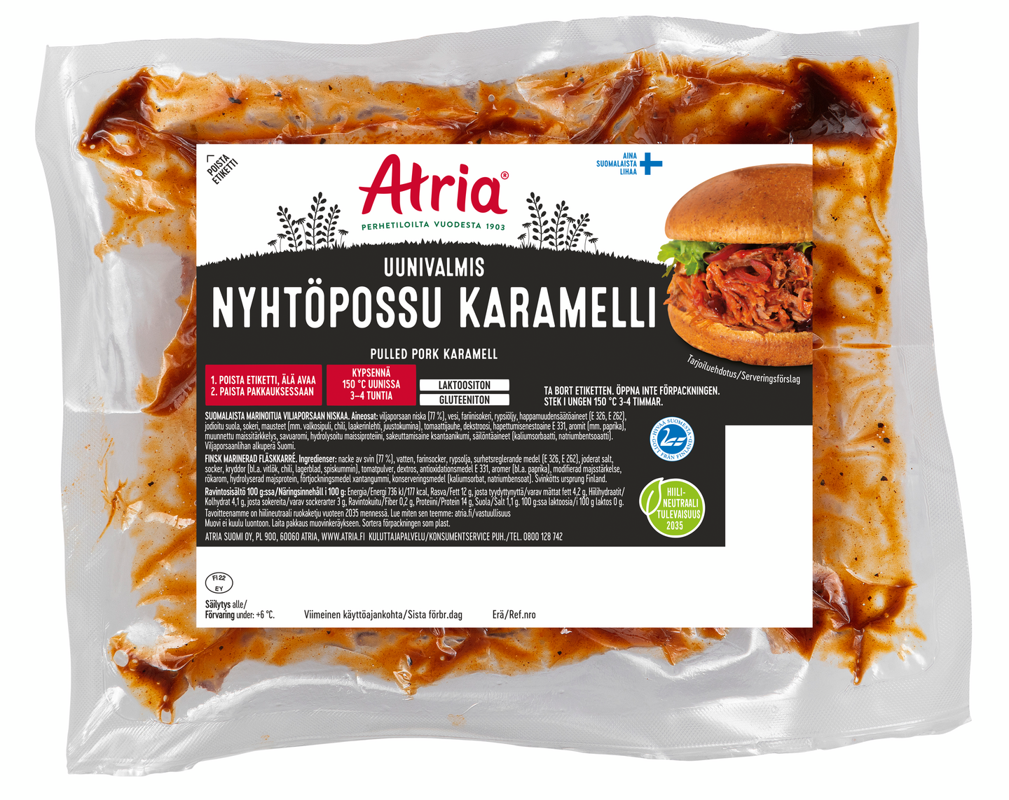Nyhtöpossu Karamellisella makumaailmalla uunivalmiissa paistopussissa on slow food -ystävien ehdoton ykkösvalinta. Valmistus on helppoa, koska liha on maustettu ja pakattu valmiiksi paistopussiin, jolloin se täytyy vain laittaa uuniin ja odottaa maukkaan aterian valmistumista täysin itsestään. Nyhtöpossu kypsennetään uunissa miedolla lämmöllä. Uunivalmistuksessa fariinisokeria sisältävä maustekastike paahtaa possun niskalle herkullisen karamellisoituneen pinnan. Yksittäisen tuotteen keskimääräinen paino on 1 300 g.