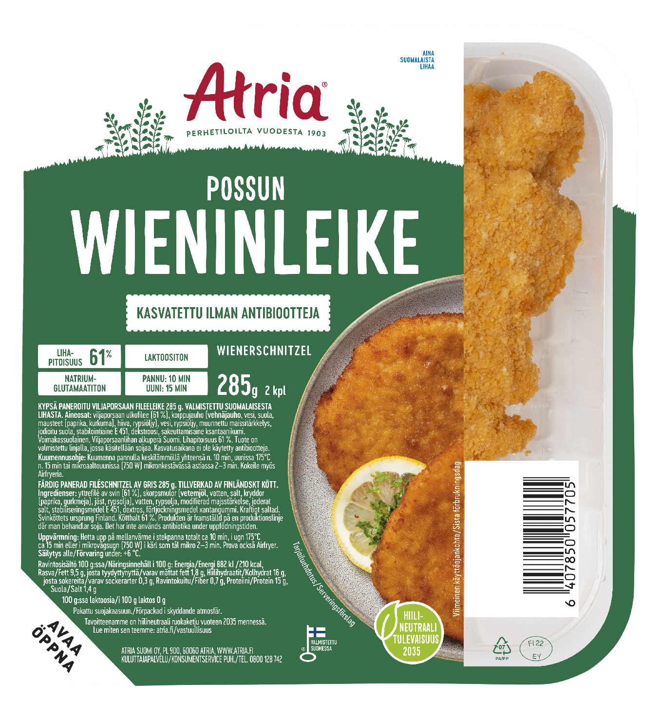 Atria Possun Wieninleike on paneroitu porsaan ulkofileeleike, joka on valmistettu suomalaisesta lihasta. Atrian Possun Wieninleike on saatavilla kahden leikkeen pakkauksessa. Wieninleike on valmiiksi kypsä ja sen valmistamiseen kuluu vain kuumennusaika. Lämmitä leike pannulla tai uunissa. Voit tarjoilla maukkaan Wieninleikkeen sitruunalohkon sekä ranskalaisten perunoiden tai salaatin kanssa. Wieninleike sopii mainiosti lounaaksi tai päivälliseksi.