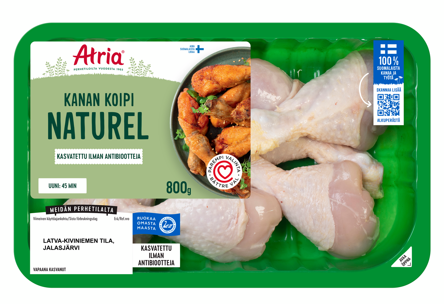 Atria kanankoivet on helppo valmistaa monella eri tavalla. Maustamattomat kanankoipemme ovat suomalaista kanaa. Ota koivet huoneenlämpöön ½ tuntia ennen kypsentämistä. Levitä koivet tasaisesti uunipellille leivinpaperin päälle ja paista 175°C tasalämpöuunissa n. 45 min, kunnes sisälämpötila on 75°C. Antibioottivapaa-merkintä pakkauksessa kertoo, että eläimet eivät ole tarvinneet ainuttakaan antibioottikuuria elämänsä aikana.
