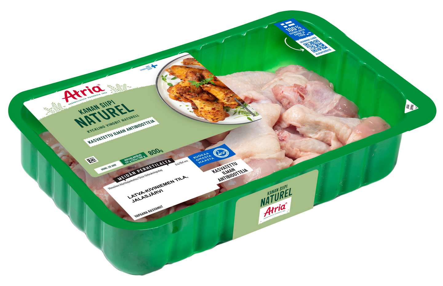 Atria maustamattomat kanansiivet valmistat helpoiten uunissa. Voit marinoida tai pintamaustaa maustamattomat siivet haluamallasi tavalla. Siipien kanssa maistuvan kokonaisuuden luo pilkotut kasvikset, kuten porkkanat, paprikat, kurkut tai varsisellerit. Lisäksi voit tehdä niin kanansiiville, kuin kasviksille oman dipin täydentämään jo herkullista makumaailmaa. Ota siivet huoneenlämpöön ½ tuntia ennen kypsentämistä. Levitä siivet tasaisesti uunipellille leivinpaperin päälle ja paista 250°C tasalämpöuunissa n. 25 min, kunnes sisälämpötila on 75°C. Siivistä saa mukavan rapeita pinnasta, kun ne asettelee uunipellille hieman erilleen toisistaan. Näin siivet myös kypsyvät tasaisemmin. Antibioottivapaa-merkintä pakkauksessa kertoo, että eläimet eivät ole tarvinneet ainuttakaan antibioottikuuria elämänsä aikana.
