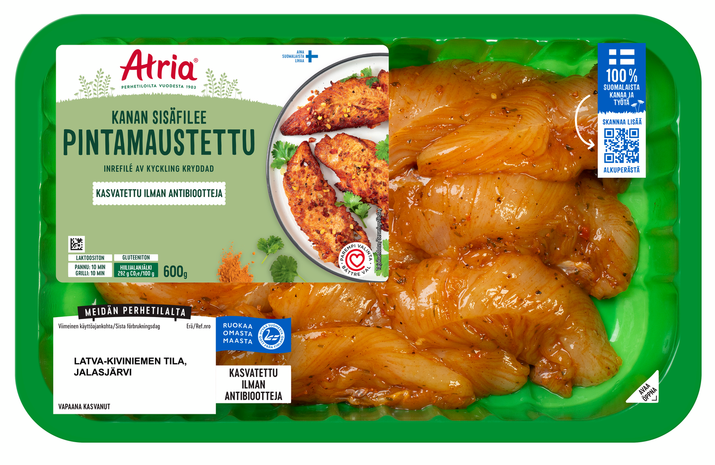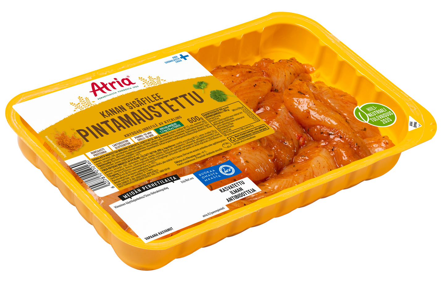 Atria pintamaustettu kanan sisäfilee 600 g pakkauksesta riittää syötävää isommallekin porukalle. Kanan sisäfileepalan voi paistaa pannulla öljyssä tai grillata. Kanan sisäfileessä on melko vähän rasvaa, joten kypsentämisen kanssa kannattaa olla tarkkana, ettei fileepaloista tule kuivia. Pintamaustetut sisäfileet voit tarjoilla lukemattomilla eri tavoilla - erilaisten kastikkeitten kanssa, osana salaattia, riisin kanssa tai vaikka padassa vihannesten kanssa. Ota kanan sisäfileet huoneenlämpöön ½ tuntia ennen kypsentämistä. Grillaa tai paista kuumalla pannulla tilkassa öljyä yhteensä n. 10 min välillä kääntäen, kunnes sisälämpötila on 75°C. Antibioottivapaa-merkintä pakkauksessa kertoo, että eläimet eivät ole tarvinneet ainuttakaan antibioottikuuria elämänsä aikana.