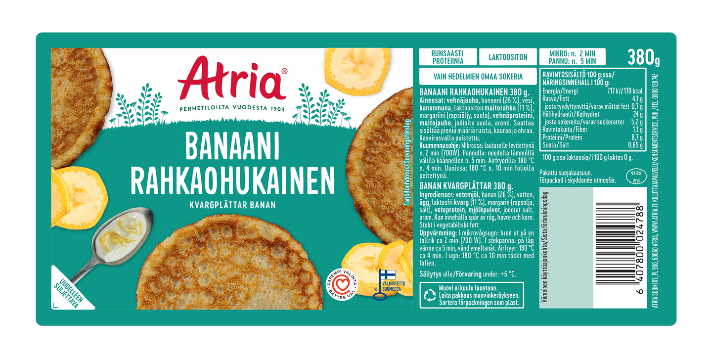 Atria Rahkaohukaiset Banaani ovat herkullinen välipala, joka maistuu koko perheelle. Rahkaohukaiset saavat makunsa pehmeästä rahkasta ja 100%sta banaanisoseesta. Rahkaohukaiset sisältävät ainoastaan hedelmien omaa sokeria ja runsaasti proteiinia, mikä tekee siitä terveellisen herkun kaikenlaisiin välipalahetkiin. Tuote on laktoositon.