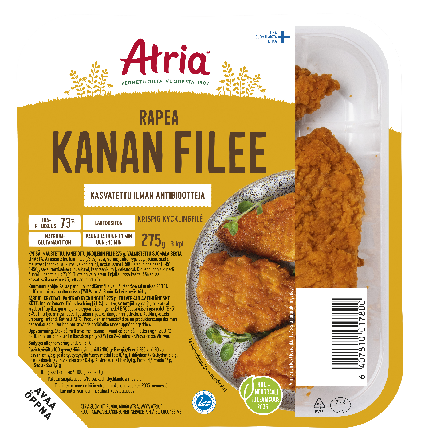 Atria Rapeat Kananfileet ovat suomalaisesta kananfileestä valmistettuja crispy-paneroituja laatufileitä. Amerikkalaistyylisen frittipaneerauksen ansiosta fileet ovat päältä rapeita ja sisältä mehukkaita. Rapeat kanafileet sopii mainiosti aterian osaksi tai kanakorin täytteeksi, burgereihin ja viipaloituna tacoihin ja salaatteihin. Crispy-paneroidut kananfileet maistuvat myös dippikastikkeen kera. Ne voidaan lämmittää uunissa tai pannulla. Pakkauksessa on kolme herkullista filettä.