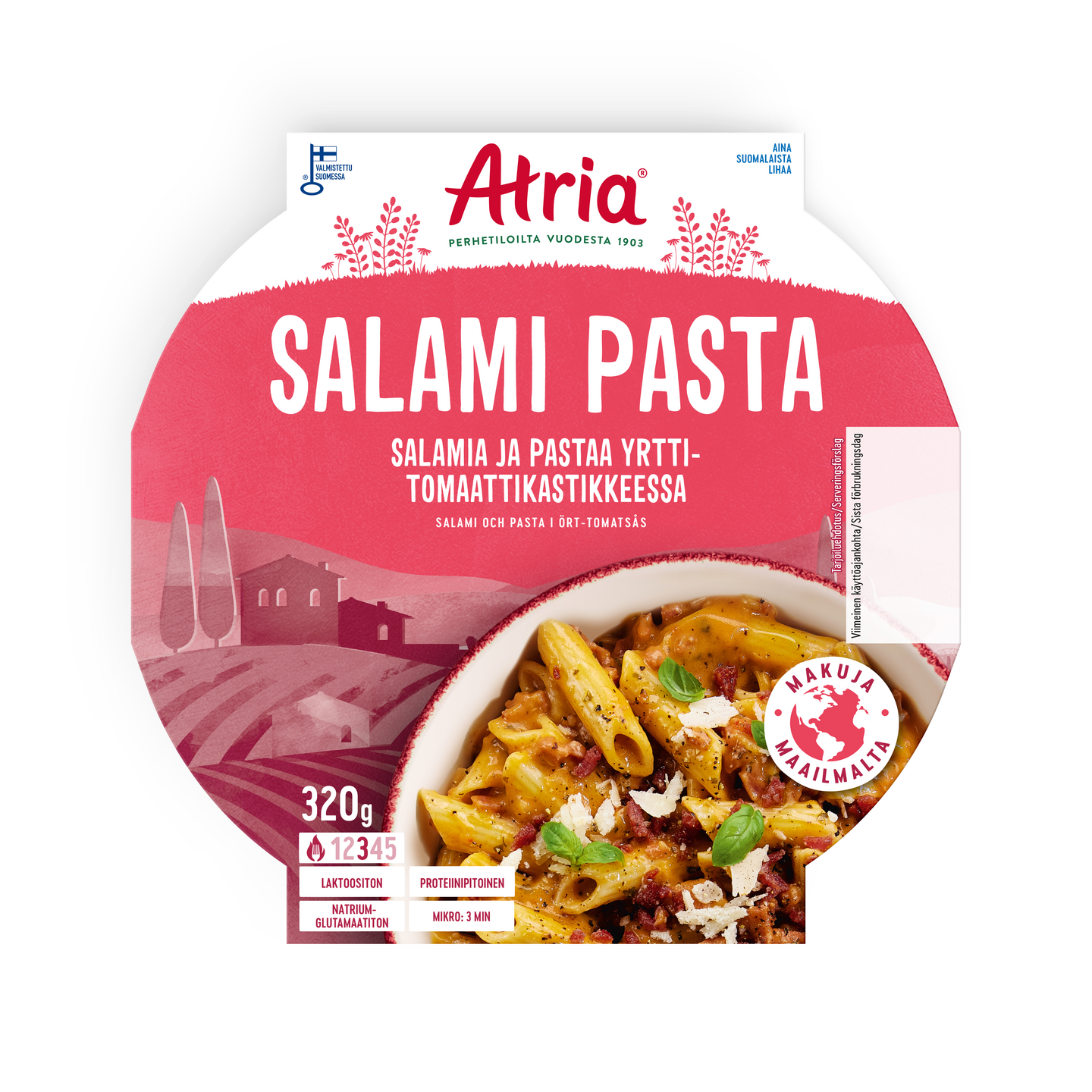 Atria Salami Pasta vie sinut makumatkalle Italiaan. Salami Pasta on valmistettu Suomalaisesta salamista, Penne-pastasta ja tomaattisesta kermakastikkeesta. Salamipasta on maukas ja täyteläinen ateria, jonka lämmität helposti mikroaaltouunissa. Tuote on laktoositon eikä se sisällä natriumglutamaattia. Lajittele pakkauksen holkki kartongin- ja kulho muovikierrätykseen. Salami Pasta on salamin ystävän herkku, jonka kanssa voit nauttia vaikka tuoreita tomaattiviipaleita.