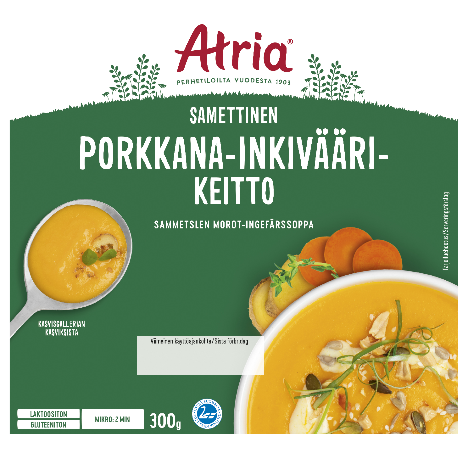 Atria Samettinen Porkkana-Inkiväärikeitto on samettisen pehmeä ja kermainen sosekeitto, josta saa kätevän lounaan tai päivällisen. Keitossa maistuu rakastettu porkkana, jonka maustaa inkivääri. Porkkana-Inkiväärikeitto lämmitetään kätevästi mikroaaltouunin kestävässä annosrasiassa, lämmitystä varten poistetaan vain foliokansi. Porkkana-Inkiväärikeitto ei sisällä lihaa, joten keitto sopii myös kasvissyöjälle. Lämmitetyn mikrokeiton voi koristella tuoreella persiljalla.