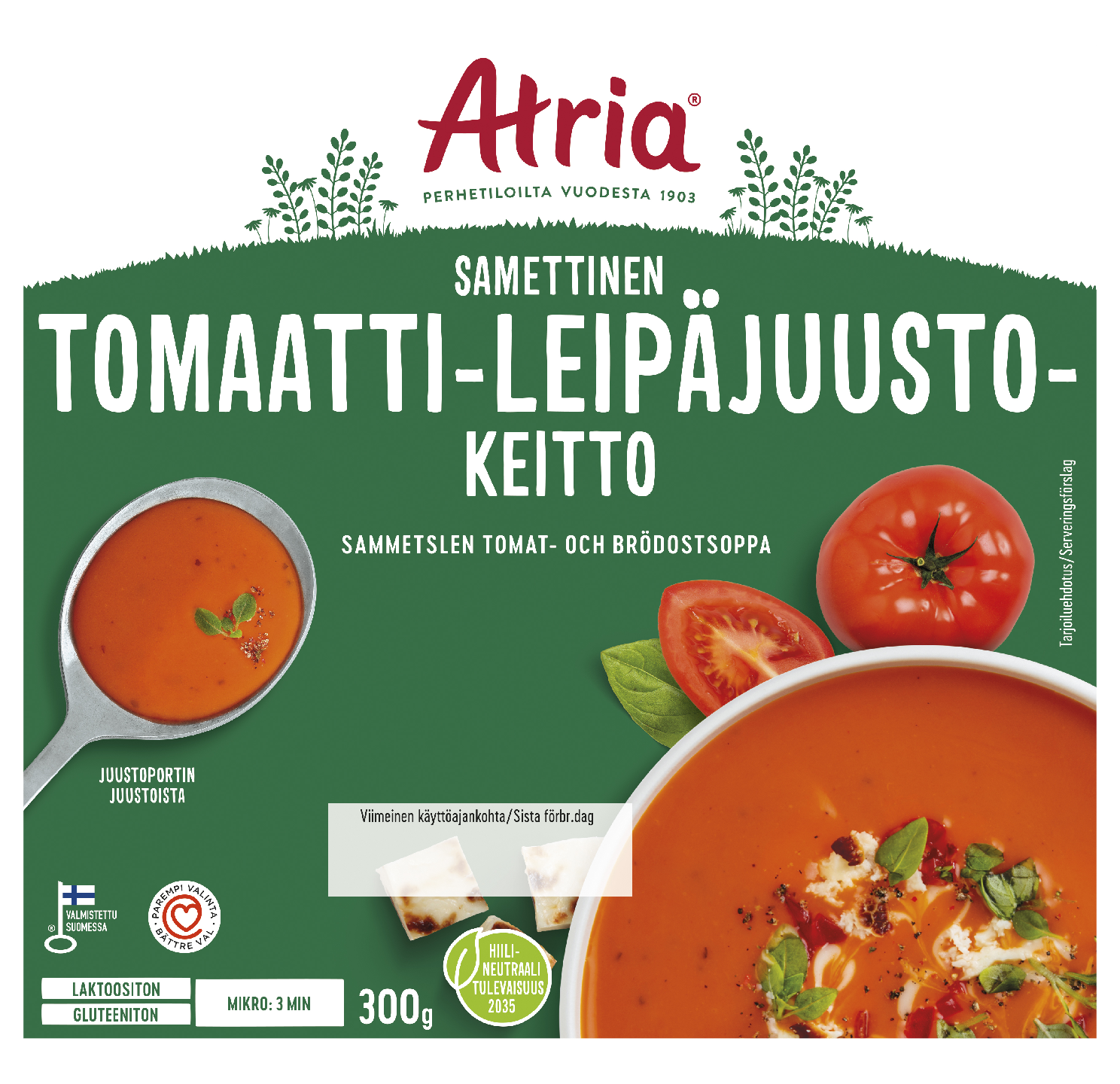 Tomaatti-leipäjuustokeitto on samettisen pehmeä valmiskeitto, josta saa kätevän lounaan tai pienen nälän päivällisen. Atrian Samettisessa Tomaatti-Leipäjuustokeitossa on käytetty suomalaisen Juustoportin leipäjuustoa. Tomaatti-leipäjuustokeitto lämmitetään kätevästi mikroaaltouunin kestävässä annosrasiassa, lämmitystä varten poistetaan vain foliokansi. Tomaatti-leipäjuustokeitto on laktoositon ja gluteeniton, eikä se sisällä lihaa, joten keitto sopii myös kasvissyöjälle. Lämmitetyn tomaatti-leipäjuustokeiton voi koristella tuoreella basilikalla tai lehtipersiljalla.