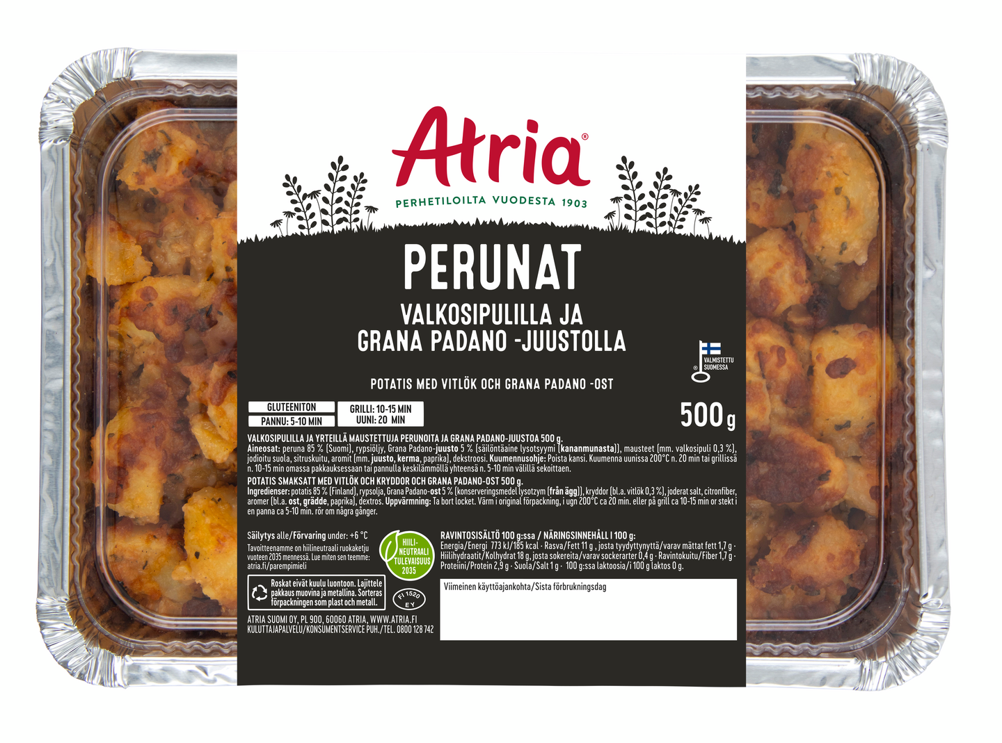 Täyteläiset valkosipuliperunat ovat koko perheen makuun. Grana Padano -juustolla maustetut valkosipuliperunat sopivat lisukkeeksi liharuuille, kanalle, kalalle sekä grilliherkuille. Atria Perunat Valkosipulilla ja Grana Padano -Juustolla ovat pakattu alumiiniseen uunivuokaan, jota voi käyttää perunoiden lämmittämiseen uunissa tai grillissä. Valkosipuliperunat valmistuvat tarvittaessa myös paistinpannulla.