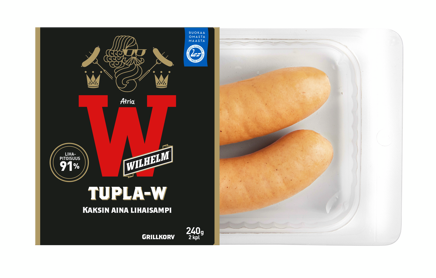 Atria Wilhelm on nyt entistä isompi, lihaisampi ja maukkaampi. Wilhelm Tupla-W tarjoaa runsaasti grillattavaa, sillä se on kooltaan suurempi ja lihapitoisuudeltaan 91%. Lisäksi sen maku on herkullisempi kuin koskaan. Tämä on täydellinen valinta lihaisten grillimakkaroiden ystäville. Wilhelm Tupla-W on pakattu kätevään kahden kappaleen rasiapakkaukseen.