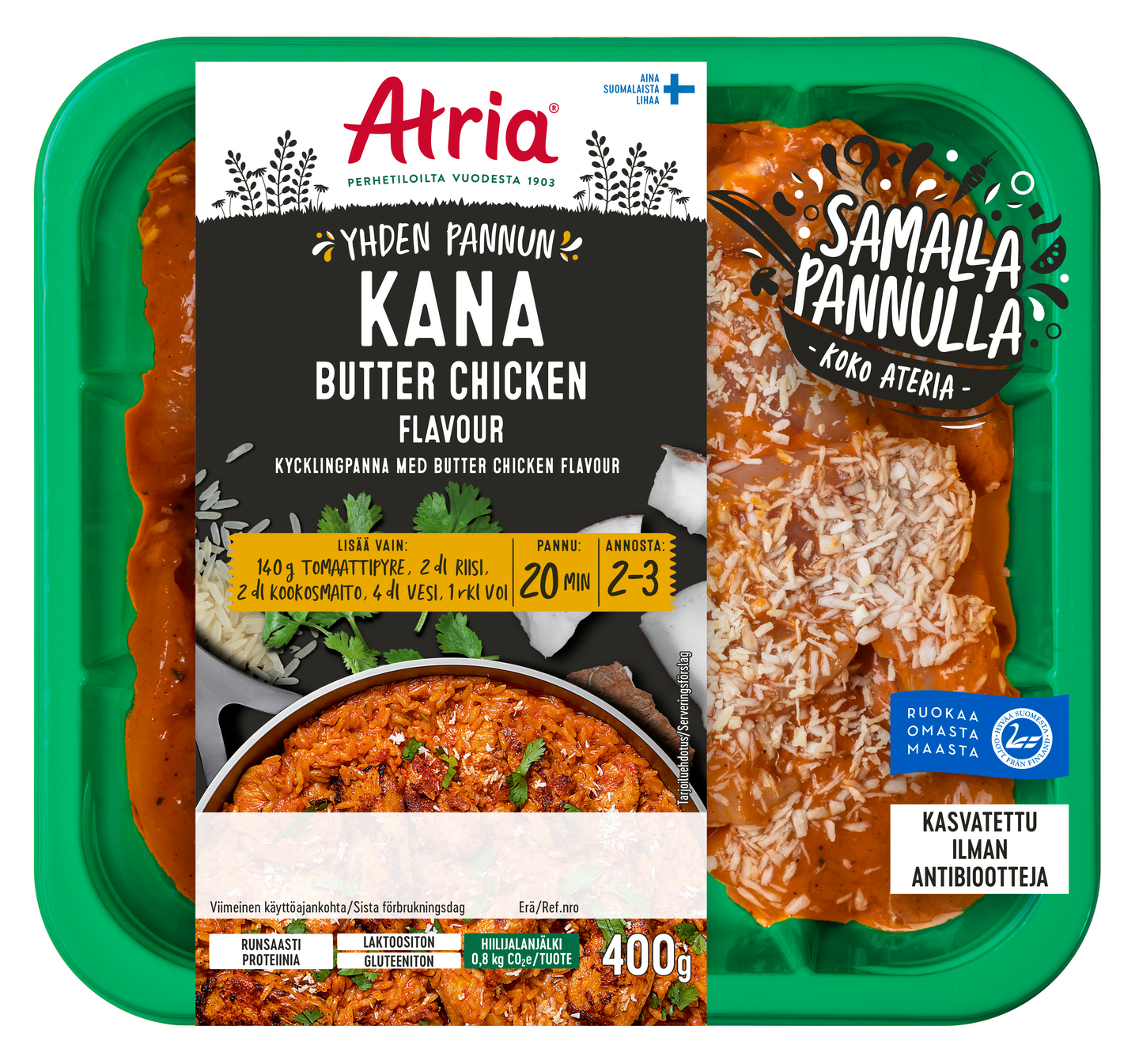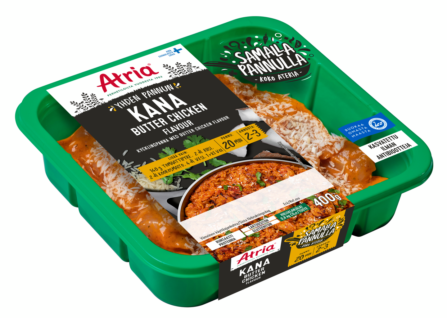 Atria Yhden Pannun Kanasta valmistuu ateria yhdellä pannulla. Lisää vain riisi, kookosmaito ja tomaattipyree ruskistettuja kanapalojen joukkoon. Hauduta kypäsäksi ja koko perheen ateria on valmis 20 minuutissa. Antibiottivapaa-merkintä pakkauksessa kertoo, että eläimet eivät ole tarvinneet ainuttakaan antibioottikuuria elämänsä aikana.