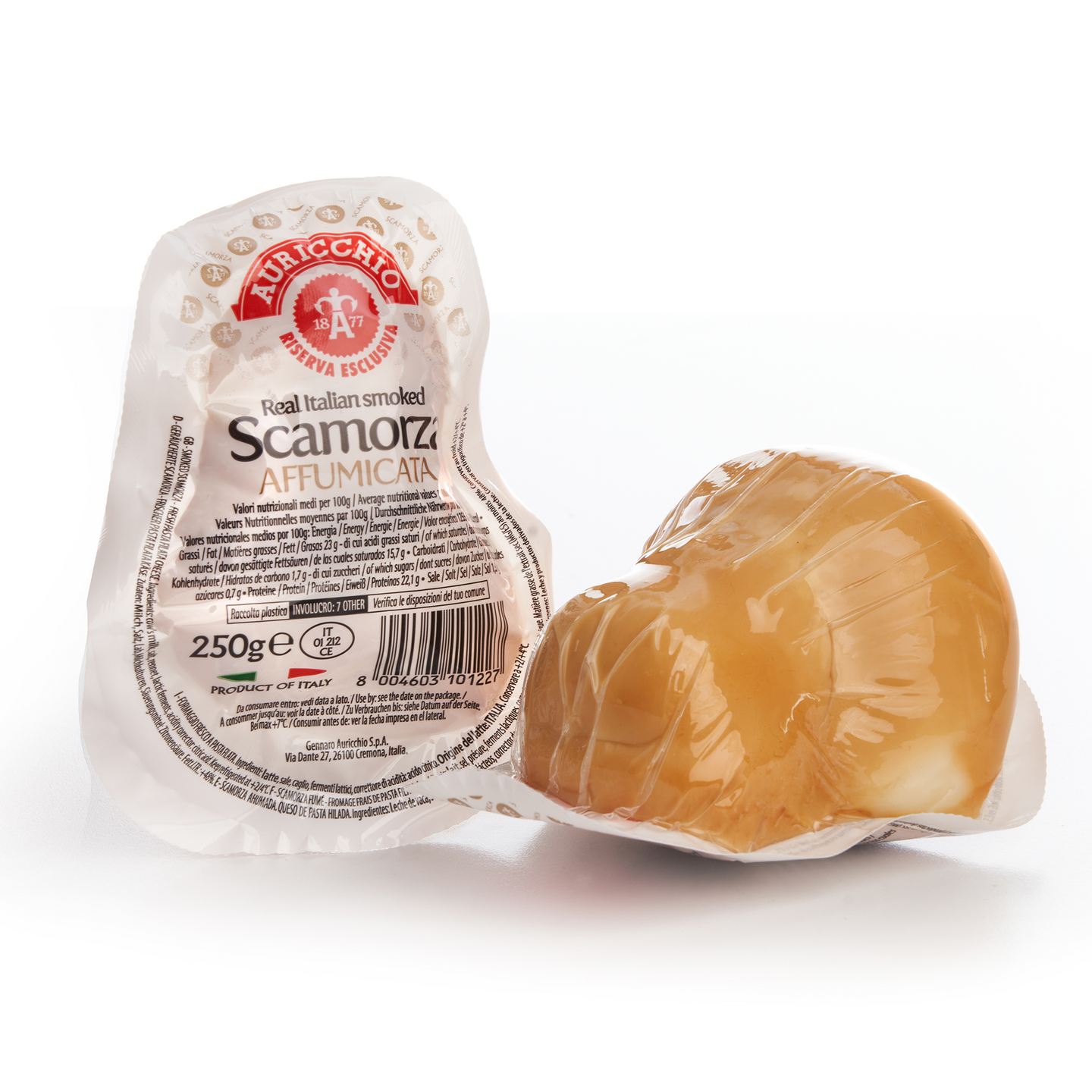 Auricchio Scamorza Affumicata on italialainen mozzarellan kaltainen juusto, joka on tehty lehmänmaidosta. Sana "affumicata" tarkoittaa italiaksi "savustettua", joten scamorza affumicata on savustettu versio scamorza-juustosta. Tämä antaa sille persoonallisen savun maun ja aromin, jonka vuoksi se erottuu muista juustoista. Tarjoile scamorza affumicata juustoa italialaisen keittiön tapaan esimerkiksi pizzan päällä tai pastaruoissa. Juusto sopii myös erinomaisesti sellaisenaan keksien ja leivän kanssa tarjoiltuna.