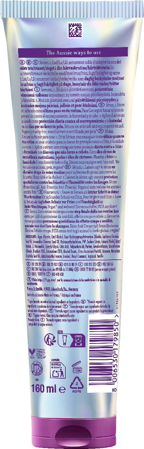 Valmiina sanomaan pörrölle, että se saa häipyä? Sano terveisiä sileille hiuksille Aussie Frizz Off 24H Anti-Frizz Leave-In Seerumilla. Australialaisen makadamiapähkinäöljyn, jojoban ja safloriöljyjen infusoima kevyt koostumus lukitsee kosteuden, suojaa lämpöä vastaan ja taistelee kosteutta vastaan 24 tuntia. Ei enää pörröisyyttä, lentäviä hiuksia tai raskaita suortuvia—vain pehmeät, kiiltävät, hyväntuoksuiset hiukset, jopa sateisimpina päivinä. Ja tiedätkö mitä? Voit käyttää sitä myös lämpösuojana!