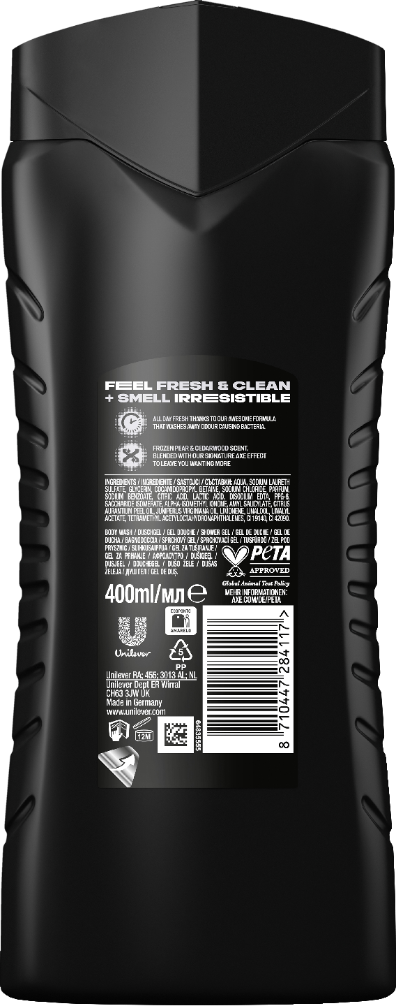 Axe Black on ylellinen suihkusaippua, joka antaa sinulle pitkäkestoisen raikkaan ja virkistävän tunteen. Maskuliininen Axe Black on luotu miehen vartalolle. Se herättää sinut uuteen aamuun ja pitää raikkaana koko päivän. Axe Black on ylellinen vaahtoava suihkugeeli, jossa on hienovarainen bergamotin, jäädytettyjen päärynöiden ja seetrin tuoksu. Lopputuloksena hyväntuoksuinen, puhdas ja pehmeä iho, sekä raikas tunne koko päiväksi. Anna Axe Black -suihkusaippuan vaahdota perusteellisesti, peseydy huolella ja huuhtele saippua pois vartaloltasi. Suihkun jälkeen tunnet itsesi paitsi puhtaaksi sekä virkistyneeksi, nautit myös lyömättömästä tuoksusta, joka kestää 12 tuntia. Axe on täydellinen energisen päivän käynnistäjä. Valmistaudu seikkailuun ja arjen yllättäviinkin käänteisiin Axe Blackin avulla. Tulipa vastaan millaisia tilanteita hyvänsä, sinä olet valmis ne kohtaamaan. Axe Black sisältää 100 % kasviperäisiä kosteuttavia ainesosia, jotka tekevät ihosta pehmeän tuntuisen koko vuorokaudeksi. Axen tavoitteena on, että kaikki pakkaukset ovat kierrätettäviä tai sisältävät kierrätysmateriaaleja vuoteen 2025 mennessä. Axe Black -suihkugeeli toimitetaan jo 100 % kierrätetyssä pullossa ja se on kierrätettävä – lukuun ottamatta korkkia*. Innovatiiviset Axe-tuotteet miehille on luotu joka tilanteeseen: deodorantit, antiperspirantit, suihkugeelit, hajuvedet, hiustenmuotoilutuotteet. Kun haluat tuoksua vastustamattomalta, valikoimastamme löytyy jokaiselle oikea vaihtoehto. Joko tunnet nämä Axe-tuotteet: • Axe Black: hienostunut ja hienovarainen tuoksu, jossa yhdistyvät mm. bergamotin ja setripuun sävyt. • Axe Anarchy: rikas, mausteinen tuoksu, jossa yhdistyvät tuoreet ja hedelmäiset tuoksut, santelipuu ja valkoinen meripihka. • Axe Apollo: klassisen maskuliininen, hienostunut tuoksu, jossa on votovoimaa. Vihreiden hedelmien, santelipuun ja tuoreen salvian raikkaat sävyt pitävät sinut vahvassa otteessaan.