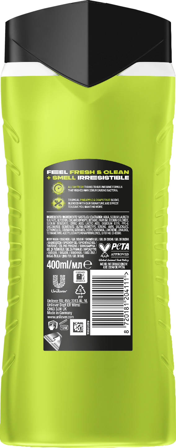 Täysin uusi, päivitetty Axe Epic Fresh -suihkugeeli virkistää olosi ja nostaa päiväsi arjen yläpuolelle. Raikas tunne koko päiväksi! Luotettava koostumus, joka pitää hajut poissa 12 tunnin ajan. Virkistävä greipin ja trooppisen ananaksen eteerisiä öljyjä sisältävä tuoksu. Saippua sisältää 100 % kasvipohjaisia kosteuttajia, jotka auttavat tekemään ihostasi silkinpehmeän. Pakkaus on valmistettu 100 % kierrätettävistä materiaaleista. Tee jokaisesta päivästä eeppinen. Ota suihku, ja käytä peseytymiseen Axe Epic fresh -suihkugeeliä - uusi Axe Epic Fresh -suihkusaippua vie tavallisen suihkuhetken uudelle tasolle. Virkistävä greipin ja trooppisen ananaksen tuoksu päihittää epämiellyttävät hajut ja innostaa sinua valloittamaan koko maailman! Tunne olosi varmaksi ja ihosi niin kosteutetuksi ja pehmeäksi, että sitä tekee mieli koskettaa. Riippumatta siitä, miten aktiivinen päiväsi on, tunnet olosi aina raikkaaksi. Axe Epic Fresh -uutuussuihkugeelimme tuoksu kestää pitempään kuin minkään muun tuoksumme! Voit siis heittää hyvästit pahoille hajuille ja tuoksua raikkaalta koko päivän. Täysin uusi Axe, tulevaisuus on täällä ja se tuoksuu uskomattoman upealta. Pidä huolta itsestäsi ja ympäristöstämme. Epic Fresh -suihkugeelin pakkaus on 100 %:n kierrätettävä. Tavoitteemme on, että vuoteen 2025 mennessä kaikki Axen pakkaukset ovat kierrätettäviä tai niissä on käytetty kierrätettyjä materiaaleja. Me Axella uskomme, että yksi vetovoiman salaisuuksista on vastustamaton tuoksu. Siksi haluamme tarjota sinulle kaikki keinot, joiden avulla voit varmistaa tuoksuvasi vastustamattomalta, kun tilanne sitä vaatii. Teemme kaikkemme, jotta keltään ei puuttuisi oikeita työkaluja viehätysvoimansa lisäämiseen. Siksi saat meiltä käyttöösi laajan valikoiman vartalosuihkeita, suihkugeelejä, antiperspirantteja ja deodorantteja – valitse mieleisesi tai joka tilanteeseen oma Axe.