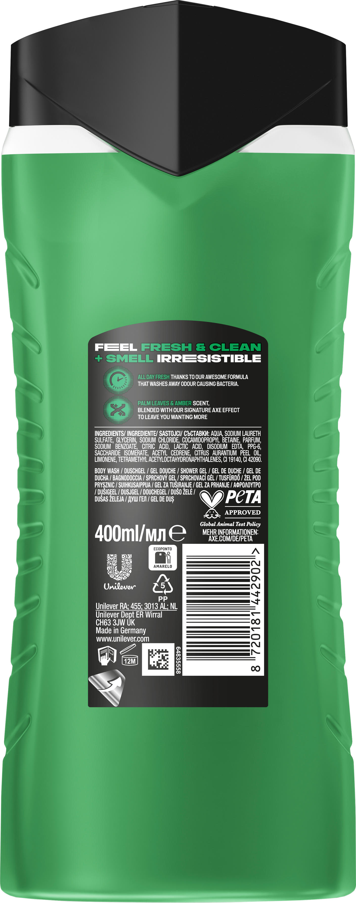 Ota suihku, astu viidakkoon ja ympäröi itsesi eksoottisilla tuoksuilla, jotka tekevät sinusta vastustamattoman. Kun käyt seuraavan kerran suihkussa, ota käteesi Axe Jungle Fresh suihkusaippua. Axe Jungle Fresh pesee lian ja hajut tehokkaasti pois päästä jalkoihin ja pitää sinut kutsuvan raikkaana koko päivän. Tuo siis esiin maskuliininen puolesi ja valmistaudu päivään 12 tunnin vertaansa vailla olevan raikkauden avulla. Raikas olo koko päivän! Anna virkistävän laventelin ja sitrushedelmien tuoksun rauhoittavan vaikutuksen tuoda sinulle energiaa loppupäiväksi. Et koskaan tiedä, mitä odottaa. Tai kenet kohtaat. Silloin haluat varmasti olla itsevarma ja vetovoimainen. Ei väliä missä liikut, sinä olet valmis. Axe Jungle Fresh on suihkugeeli, joka pesee vartalosi puhtaaksi ja saa sinut tuntemaan itsesi viidakon valtiaaksi, vaikka asfalttiviidakon. Axe suihkusaippua antaa kyytiä pahoille hajuille, jotta voit keskittyä siihen mitä teet. Tai häneen, johon haluat tehdä vaikutuksen. Voit pyörittää elämääsi omaan tahtiisi. Me Axessa uskomme, että yksi vetovoiman avaimista on ikoninen tuoksu. Siksi olemme omistautuneet tarjoamaan sinulle kaikki työkalut varmistaaksemme, että sinä tuoksut sekä puhtaan raikkaalta että vetovoimaiselta jokaisessa tilanteessa. Sinulla on aina käytössäsi ylivoimaiset ainekset alkaen suihkusaippuoista antiperspirantteihin ja vartalosuihkeista roll-oneihin. Axe on paras tapa aloittaa päivä ja tuntea itsensä voittajaksi joka hetki. Se on niin helppoa. Parasta on, että Axe Jungle Fresh suihkugeeli on 3-in-1 -tuote. Se hoitaa kolme asiaa, joihin muuten tarvitsisit kuhunkin oman tuotteen. Se on vartalon pesuaine. Se on kasvojen pesuaine, ja voit käyttää sitä hiuksiin. Se on dermatologisesti testattu ja pitää sinut raikkaana jopa 12 tunnin ajan. Täydellistä!